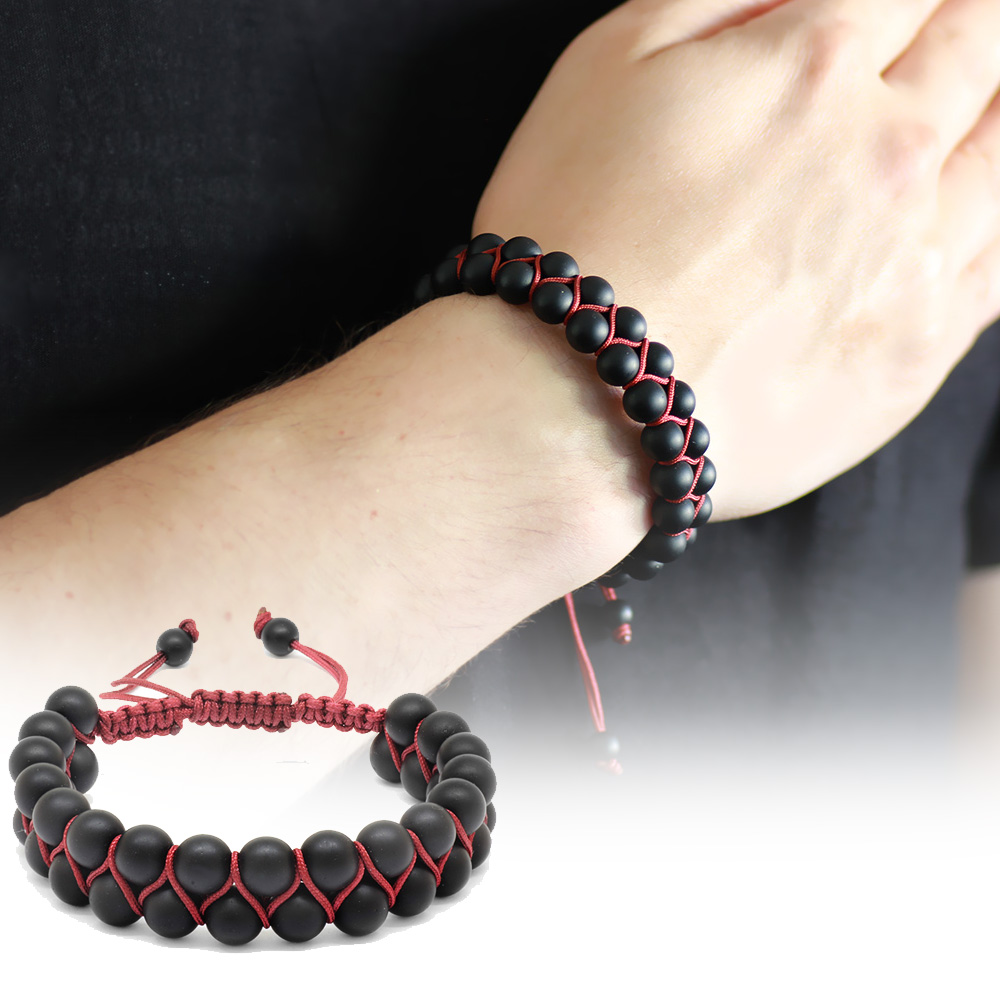 Kırmızı Makrome Örgülü Küre Kesim Çift Sıralı Oniks Doğaltaş Bileklik - 1