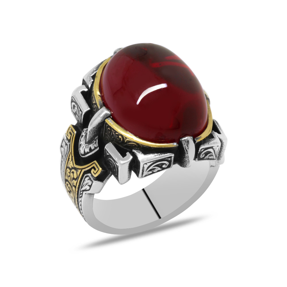 Kırmızı Ruby Taşlı Kalem İşçilik Tasarım 925 Ayar Gümüş Erkek Yüzük