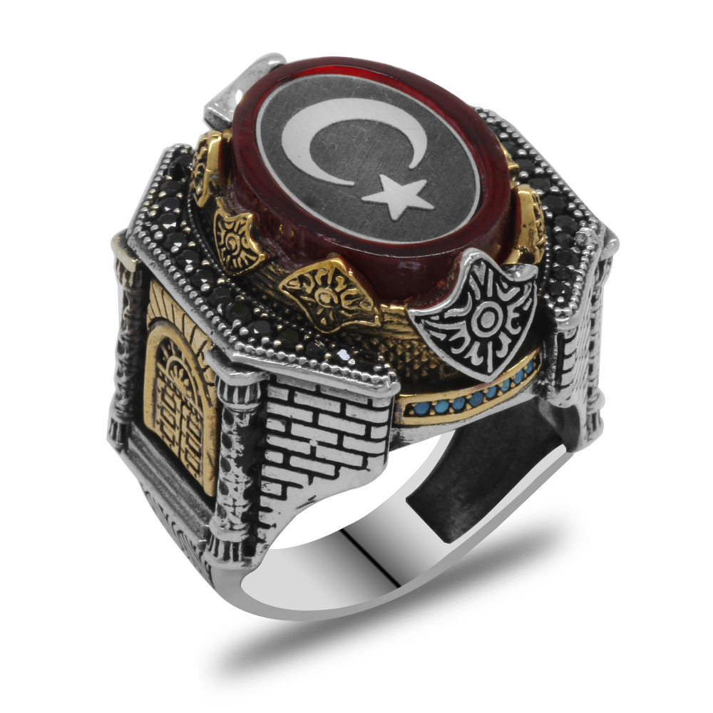 Kırmızı Sıkma Kehribar Üzerine Ayyıldız İşlemeli Yanları Kale Tasarım 925 Ayar Gümüş Erkek Yüzük