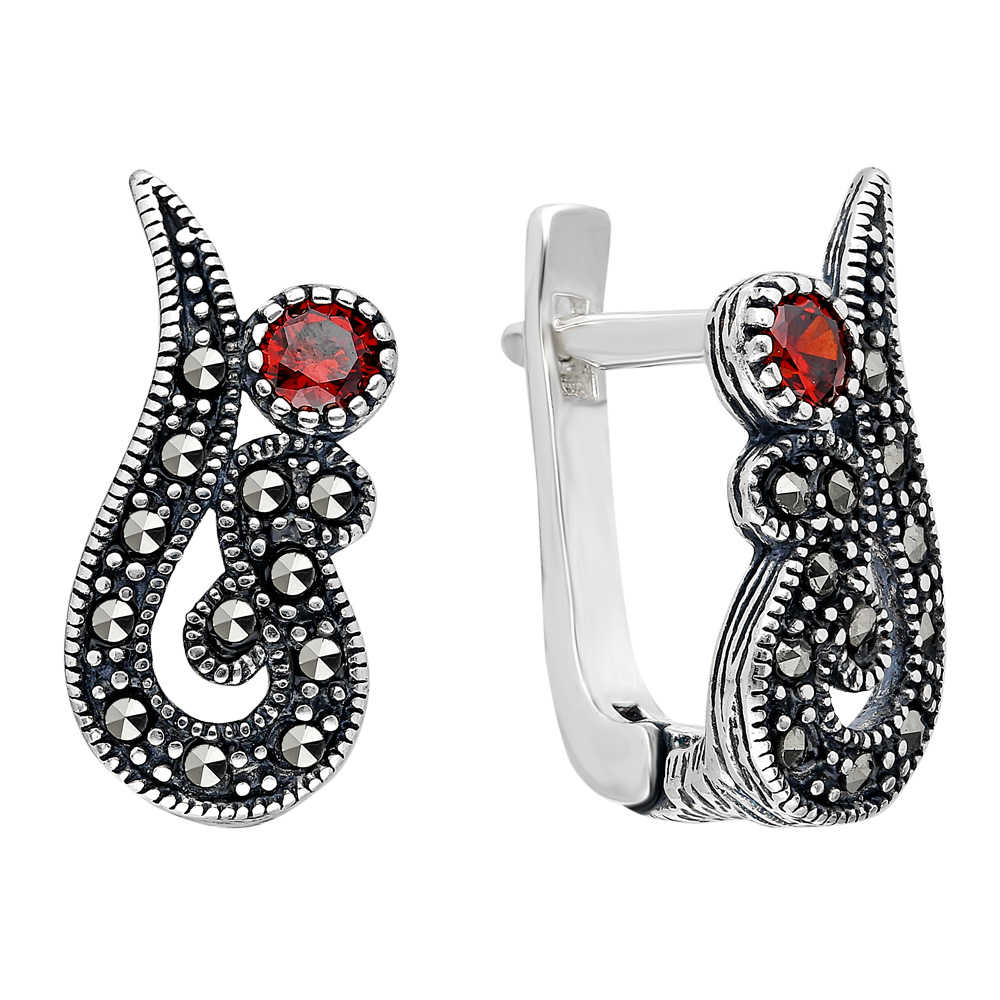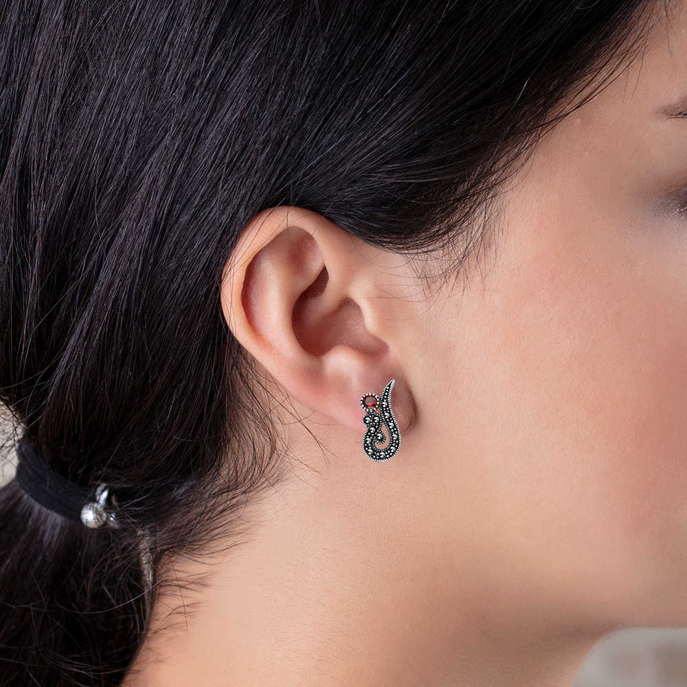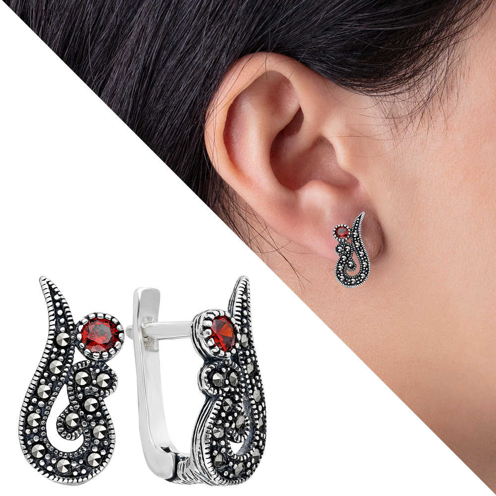 Kırmızı Zirkon Marcazit Taşlı 925 Ayar Gümüş Küpe