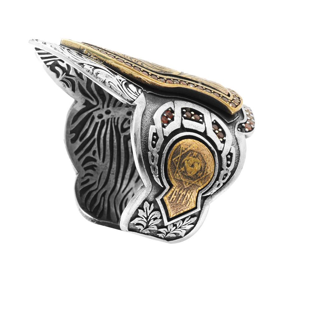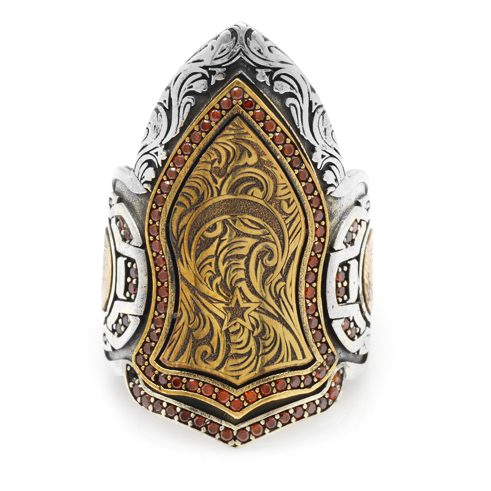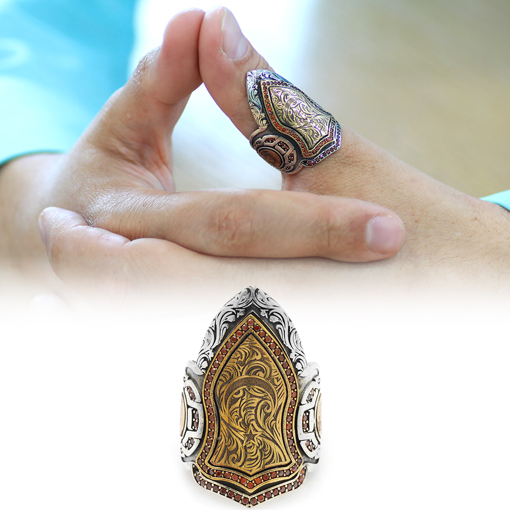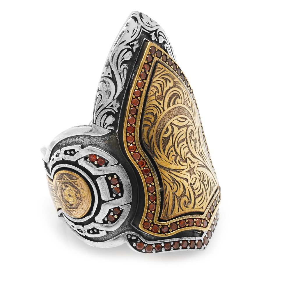 Kırmızı Zirkon Taş Mıhlamalı Kareografi Desenli 925 Ayar Gümüş Erkek Okçu Zihgir Yüzük