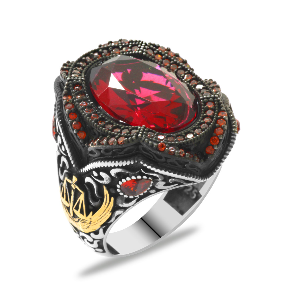 Kırmızı Zirkon Taşlı Adalet Temalı 925 Ayar Gümüş Erkek Yüzük