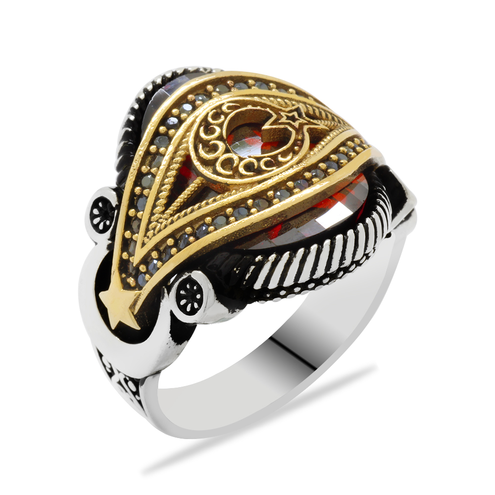 Kırmızı Zirkon Taşlı Ayyıldız Kemerli 925 Ayar Gümüş Yüzük
