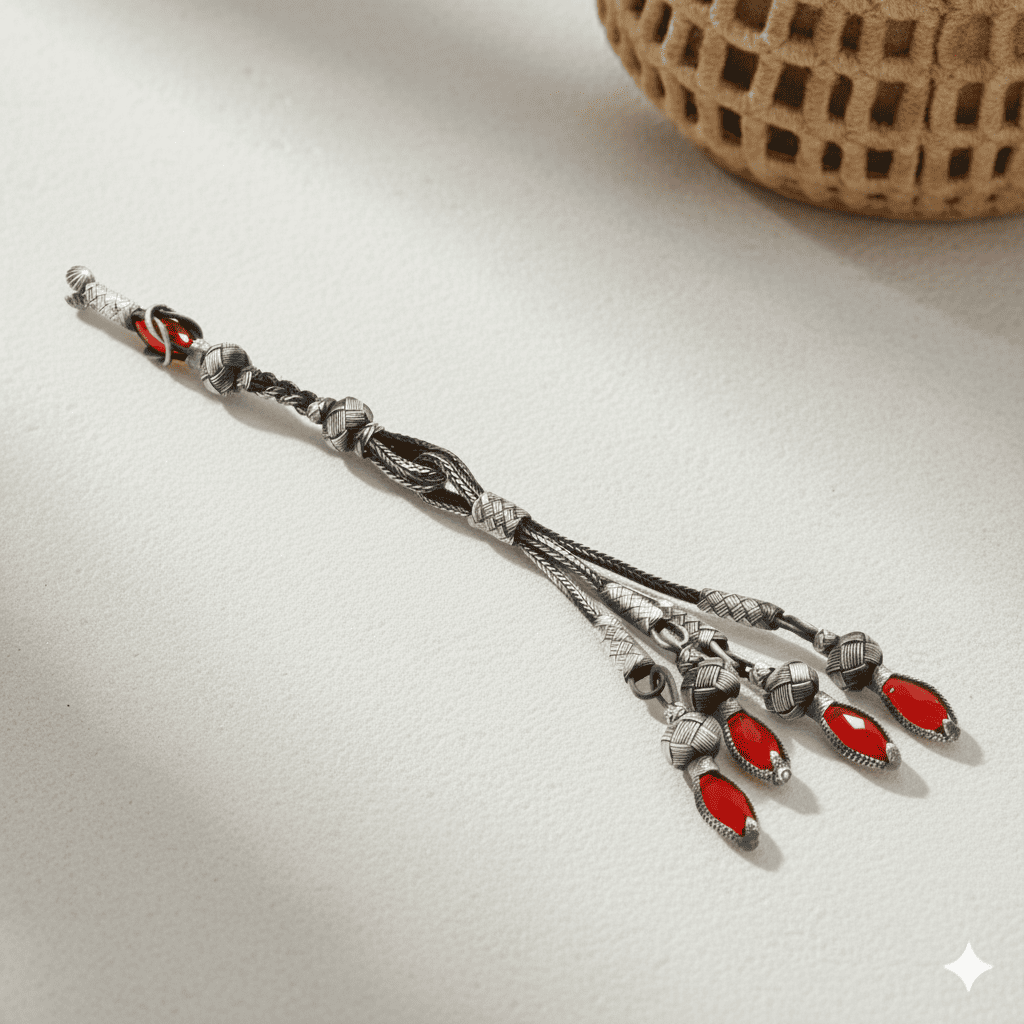Kırmızı Zirkon Taşlı Uzun Model Oksitli 4 lü 1000 Ayar Gümüş Kazaz Püskül