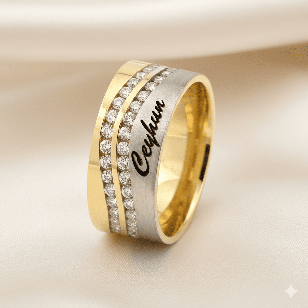 İsim Yazılı Su Yolu Tasarım Zirkon Taşlı 925 Ayar Gümüş Bayan Alyans