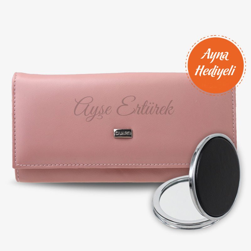 Kişiye Özel Deri Bayan Cüzdan Pembe Ayna Hediyeli