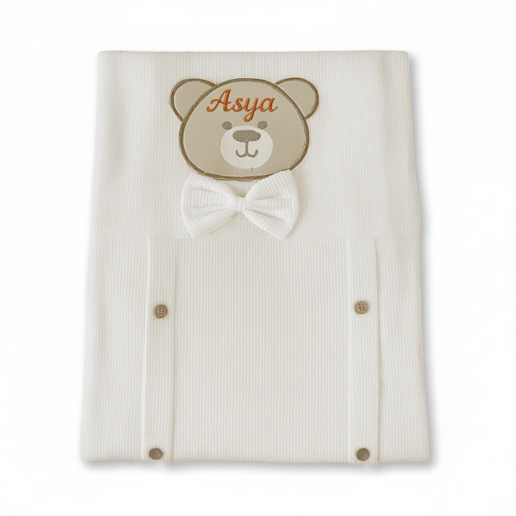 İsme Özel Nakışlı Fiyonklu Ayıcık Desenli Ekru Bebek Battaniyesi