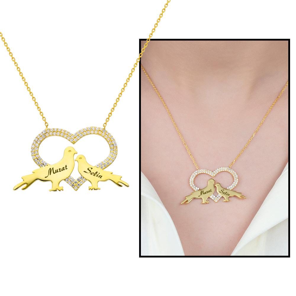 Kişiye Özel İsim Yazılı Altın Renk 925 Ayar Gümüş Kalp Güvercin Kolye