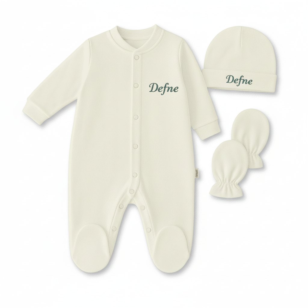 İsme özel nakışlı Krem 3’lü tulum seti, 0–3 aylık bebekler için özenle hazırlanmıştır. Tulum, şapka ve eldivenden oluşan bu takım, %100 pamuk penye dokusuyla bebeğinizin cildine yumuşak ve nefes alabilen bir konfor sunar. Krem rengiyle zarif ve sade bir görünüm sağlayan set, hem günlük kullanım hem de hastane çıkışı veya hediye olarak tercih edilebilecek şık bir seçenektir. Kişiselleştirilebilir yapısıyla bu set, bebek anılarını özel kılmak isteyen ailelerin favorisi olacak.