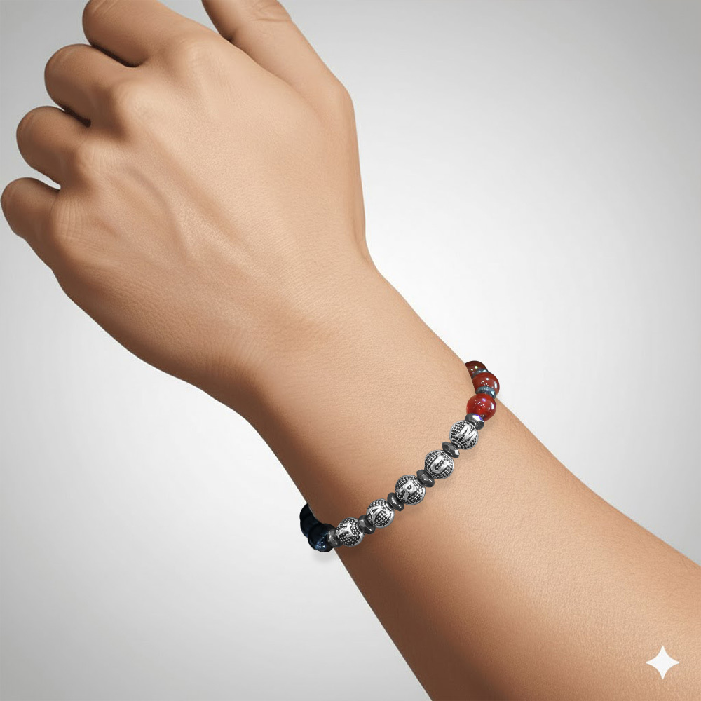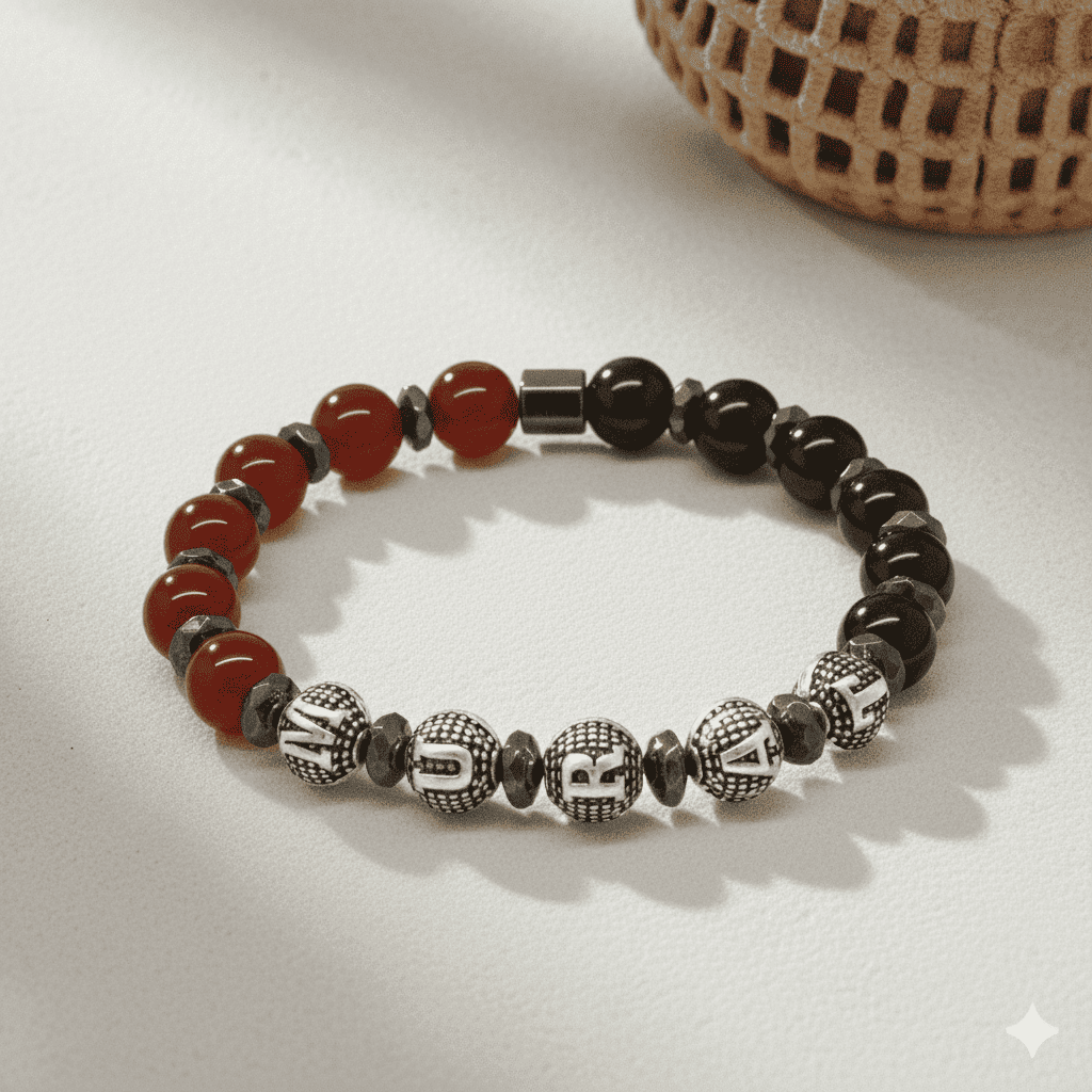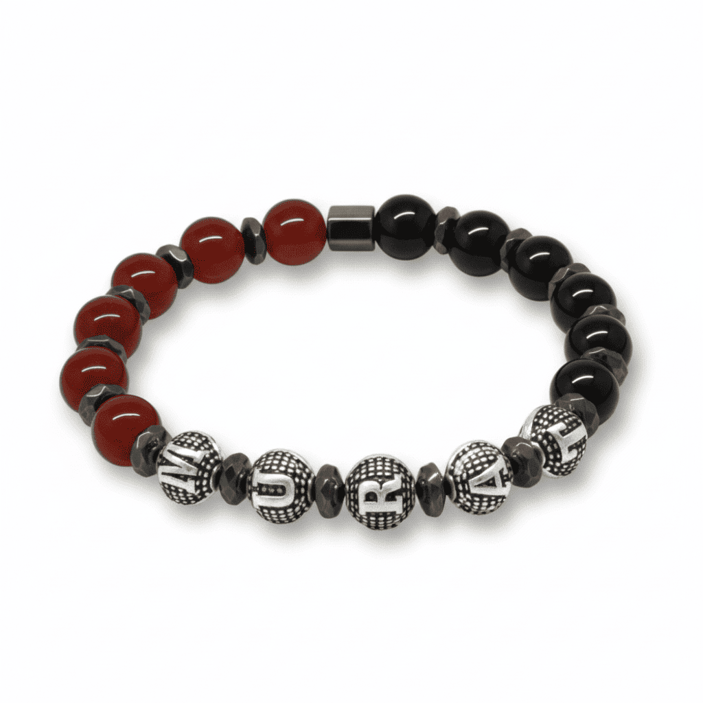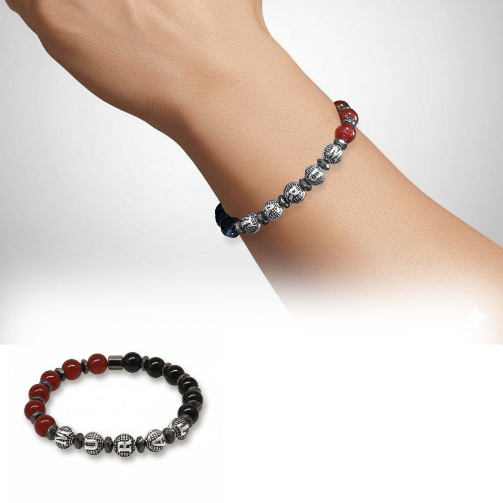 İsme Özel Yazılı Küre Kesim Kırmızı Siyah Akik Oniks Hematit Doğaltaş Erkek Taraftar Bileklik