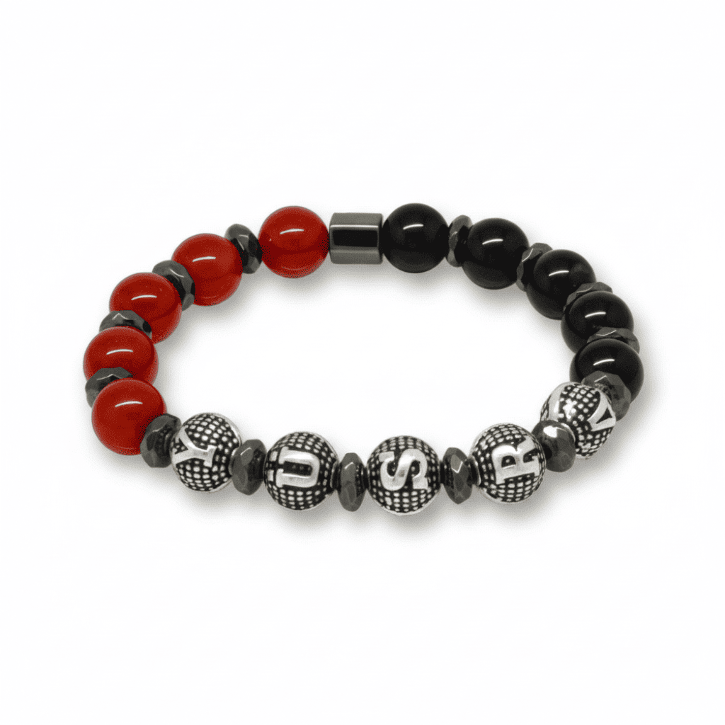 İsme Özel Yazılı Küre Kesim Kırmızı Siyah Akik Oniks Hematit Doğaltaş Kadın Taraftar Bileklik