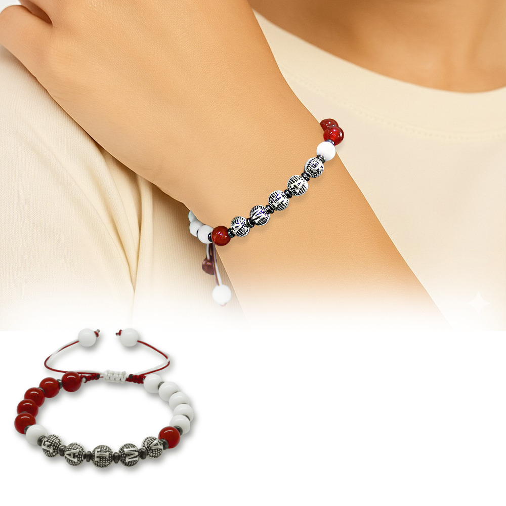 İsme Özel Yazılı Makrome Örgü Küre Kırmızı Beyaz Jade Akik Hematit Doğaltaş Kadın Taraftar Bileklik