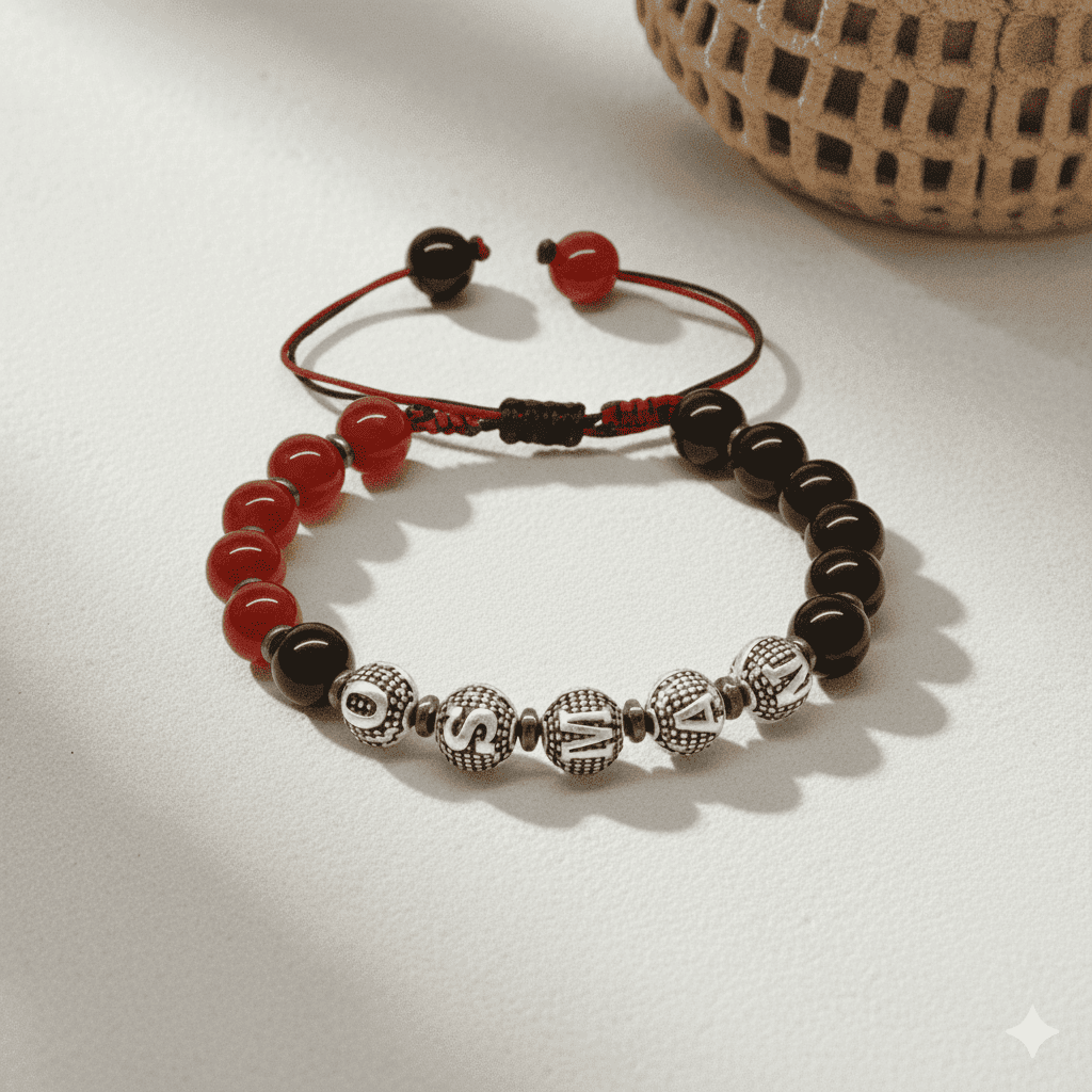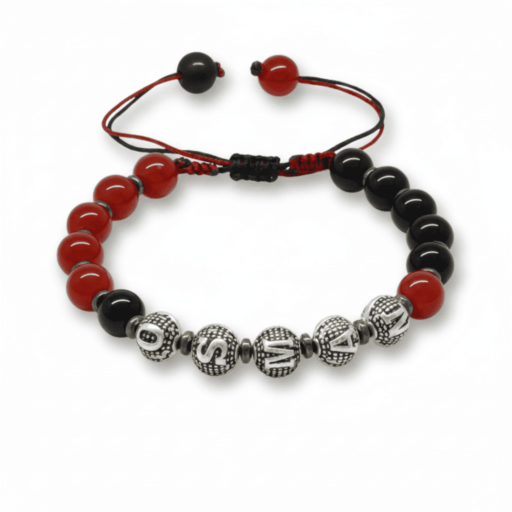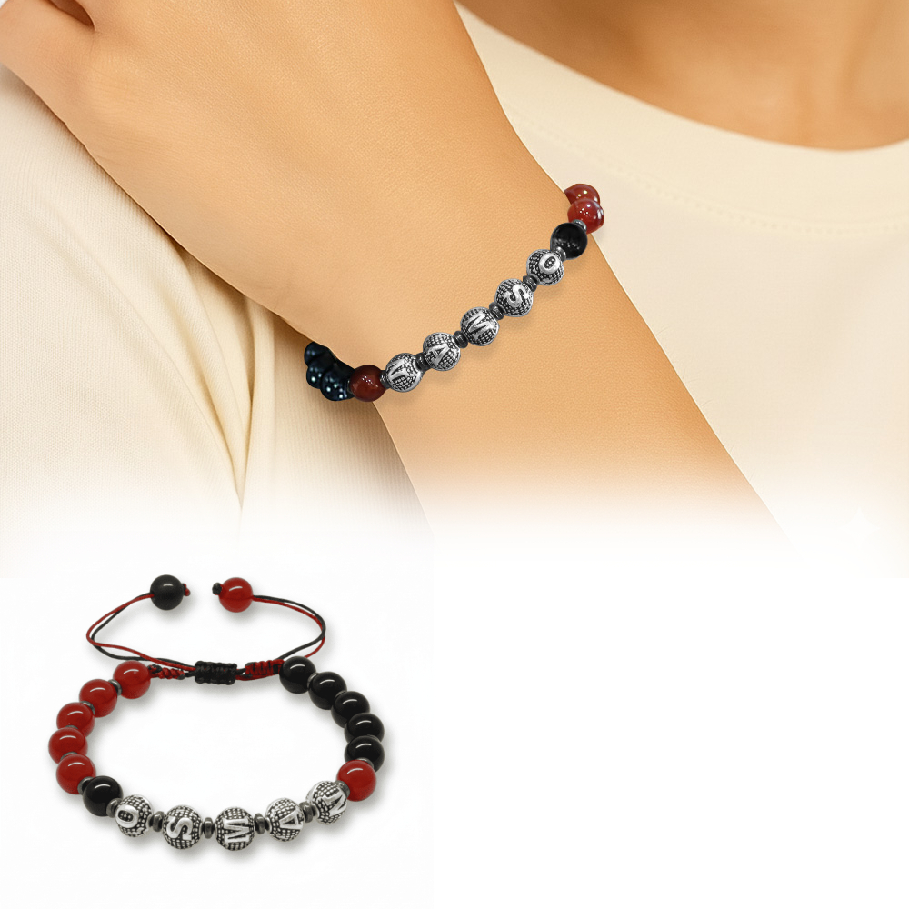İsme Özel Yazılı Makrome Örgü Küre Kırmızı Siyah Akik Oniks Hematit Doğaltaş Kadın Taraftar Bileklik