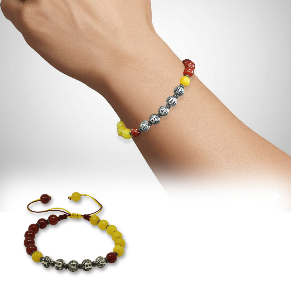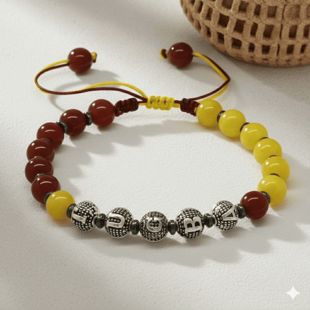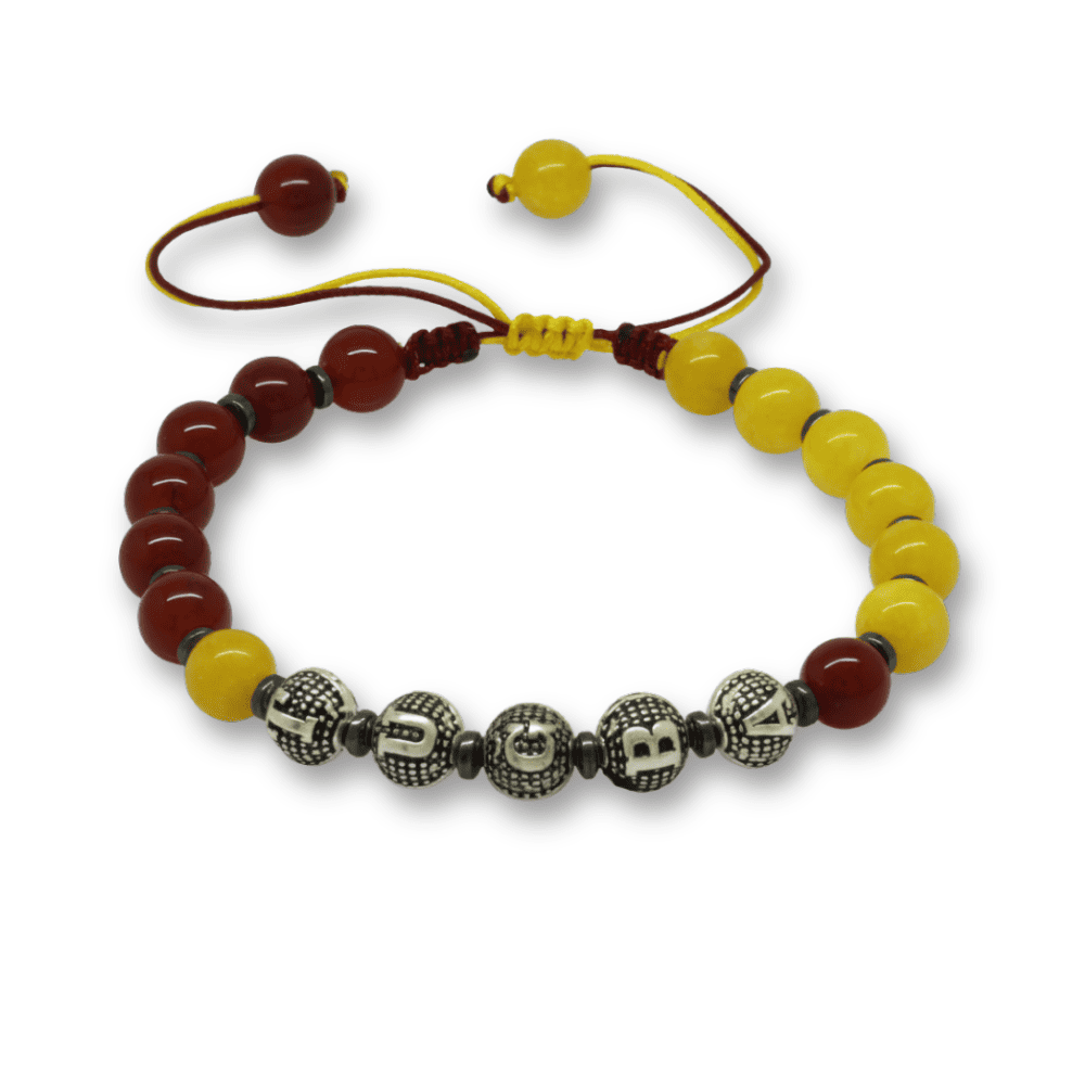 İsme Özel Yazılı Makrome Örgülü Küre Sarı Kırmızı Jade Akik Hematit Doğaltaş Erkek Taraftar Bileklik