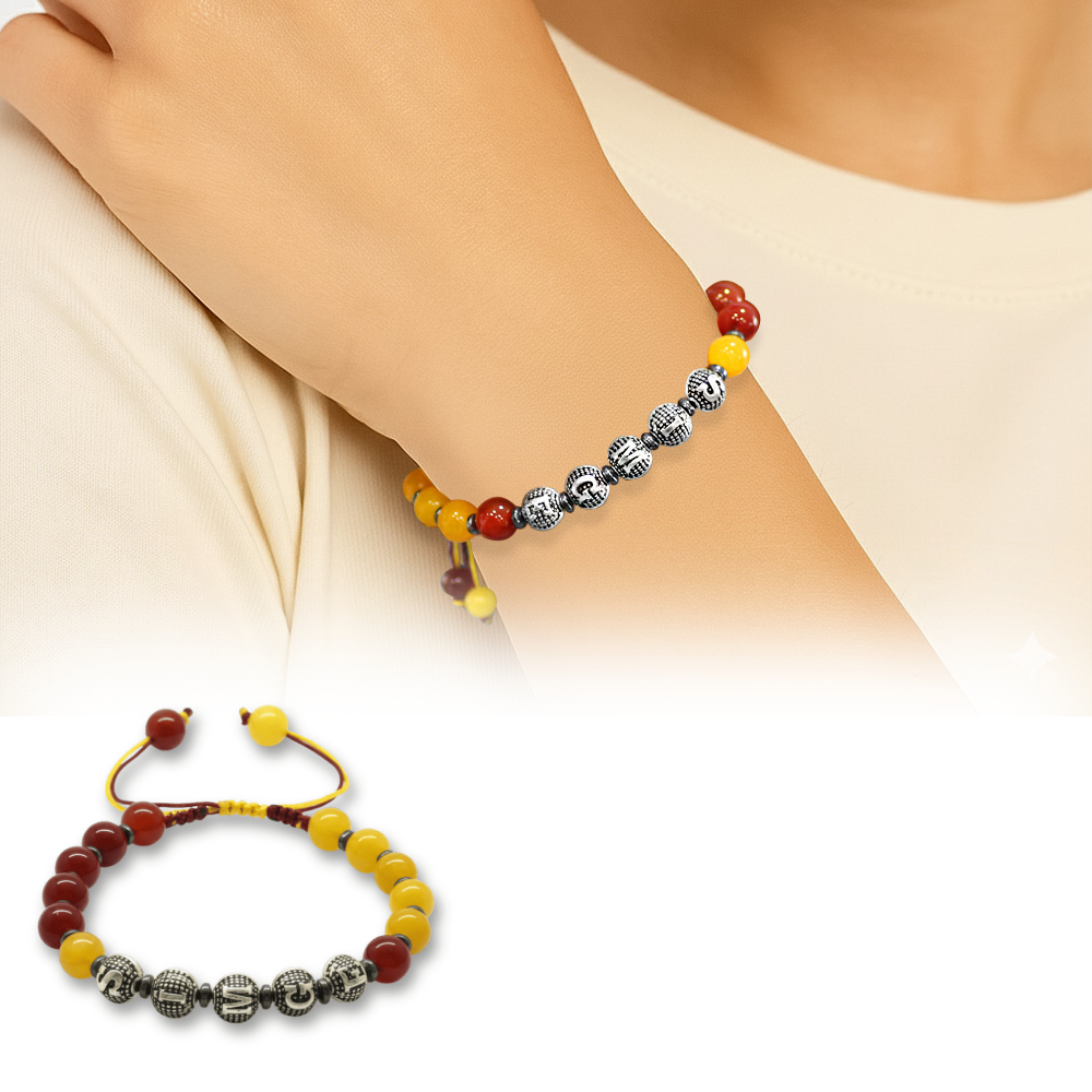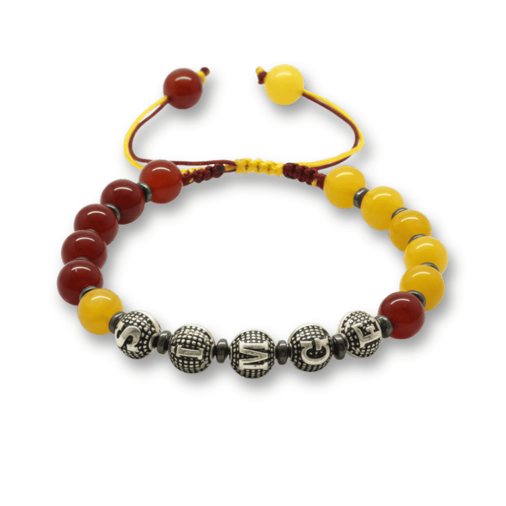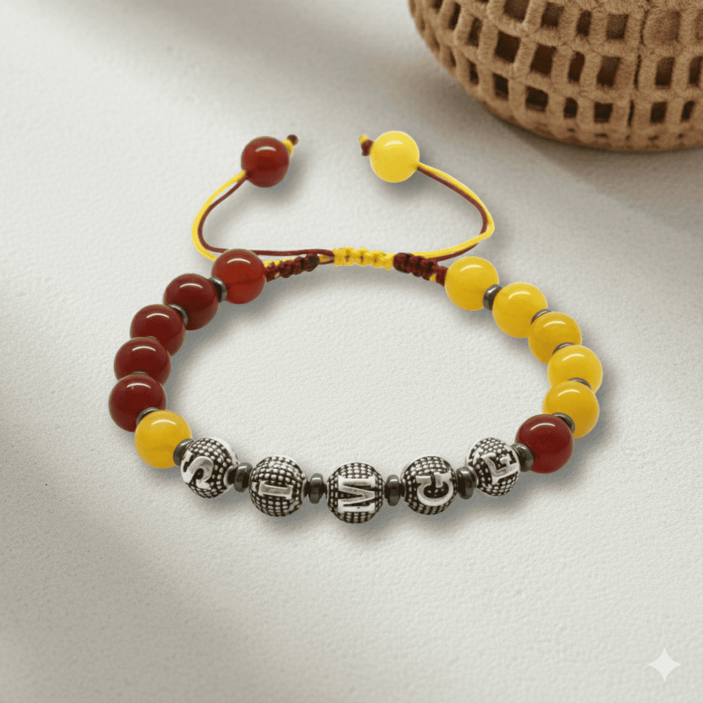 İsme Özel Yazılı Makrome Örgülü Küre Sarı Kırmızı Jade Akik Hematit Doğaltaş Kadın Taraftar Bileklik