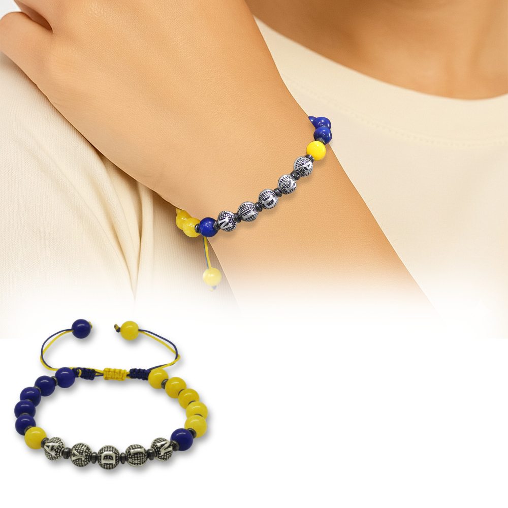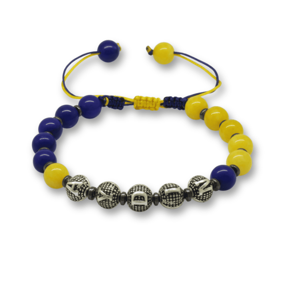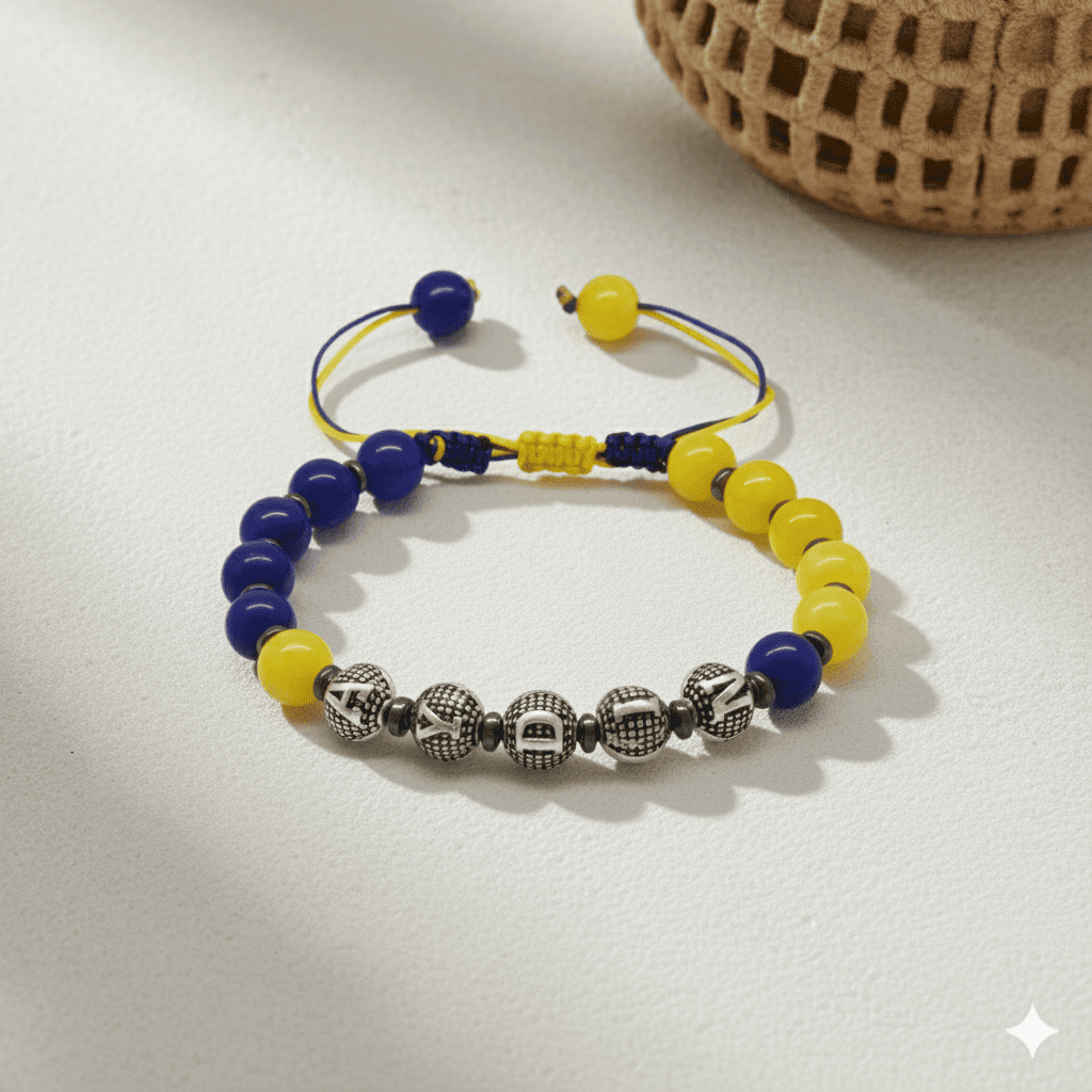 İsme Özel Yazılı Makrome Örgü Küre Kesim Sarı Lacivert Jade Hematit Doğaltaş Kadın Taraftar Bileklik