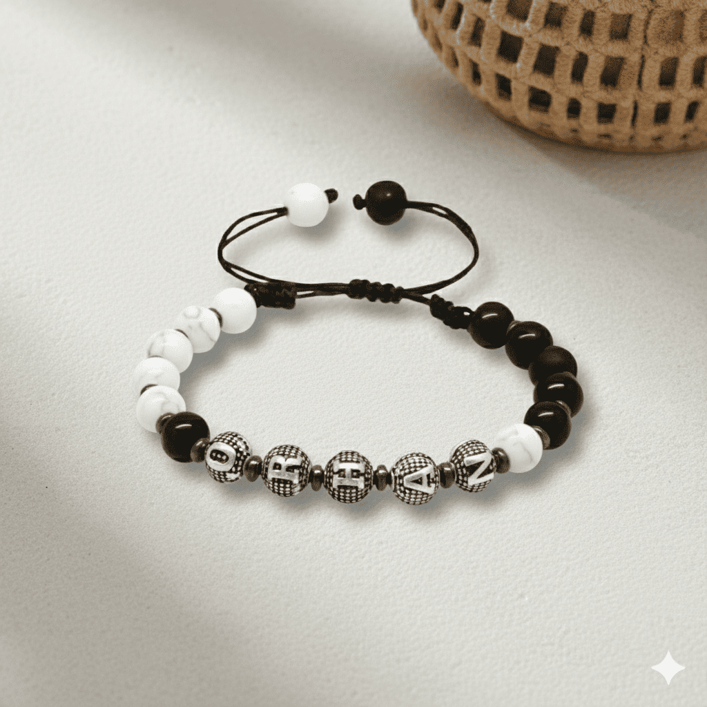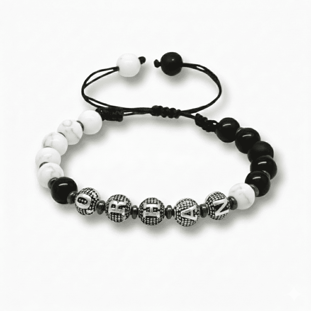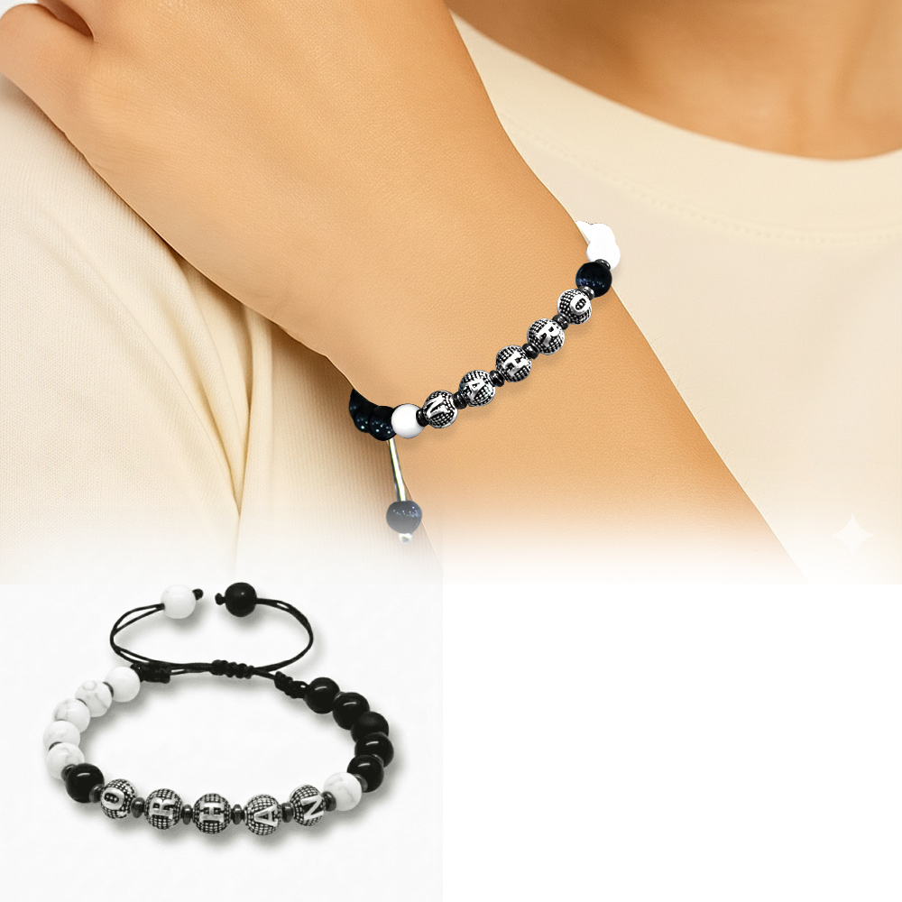 İsme Özel Yazılı Makrome Örgülü Küre Siyah Beyaz Jade Oniks Hematit Doğaltaş Kadın Taraftar Bileklik