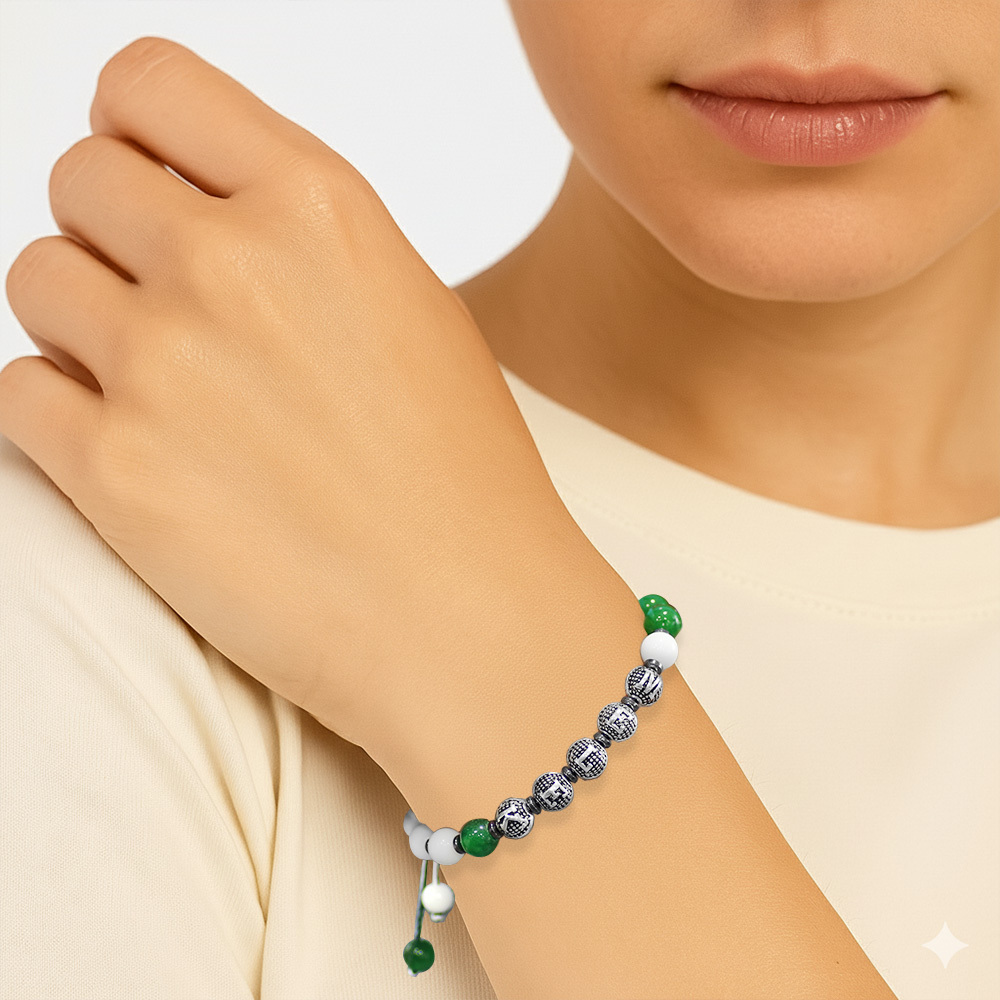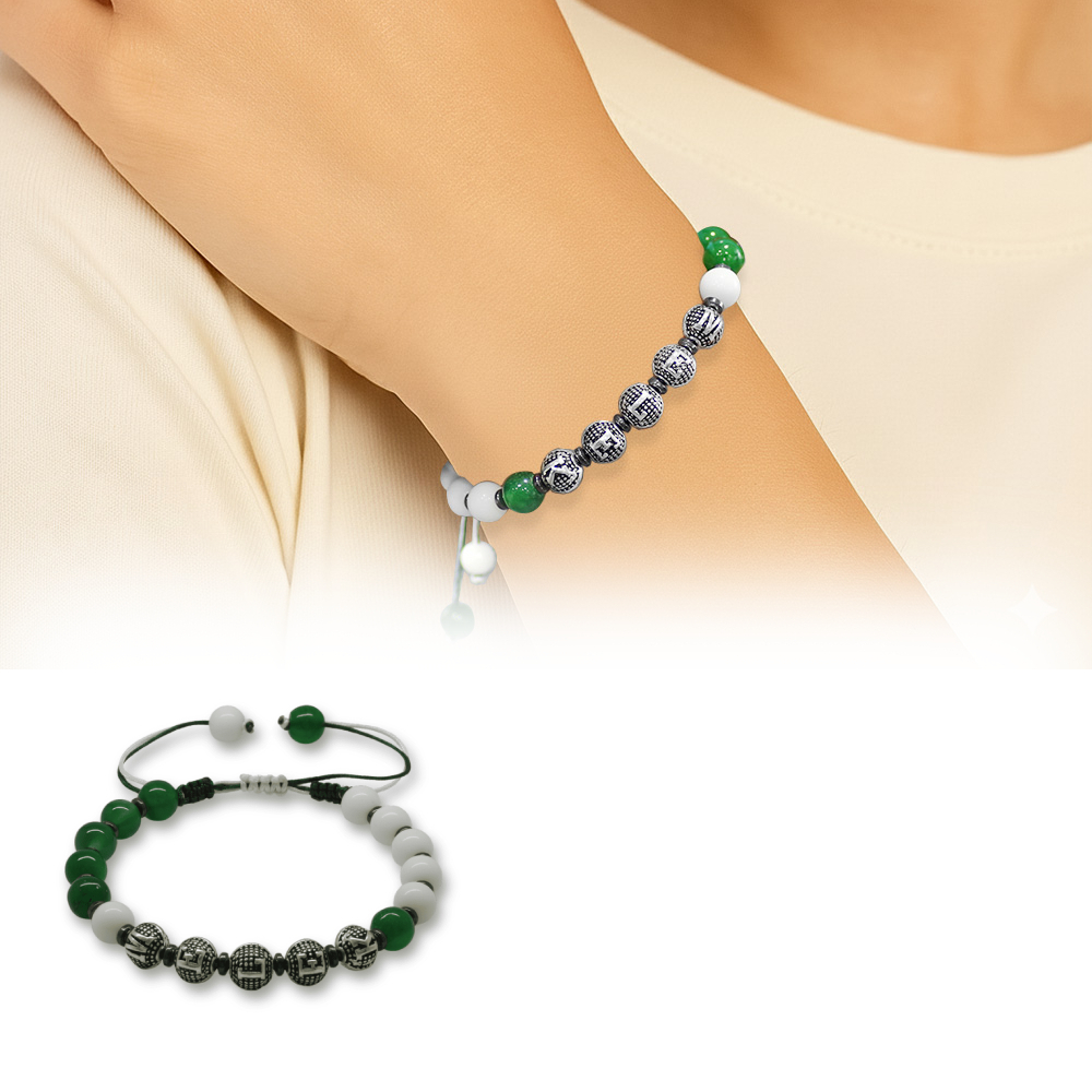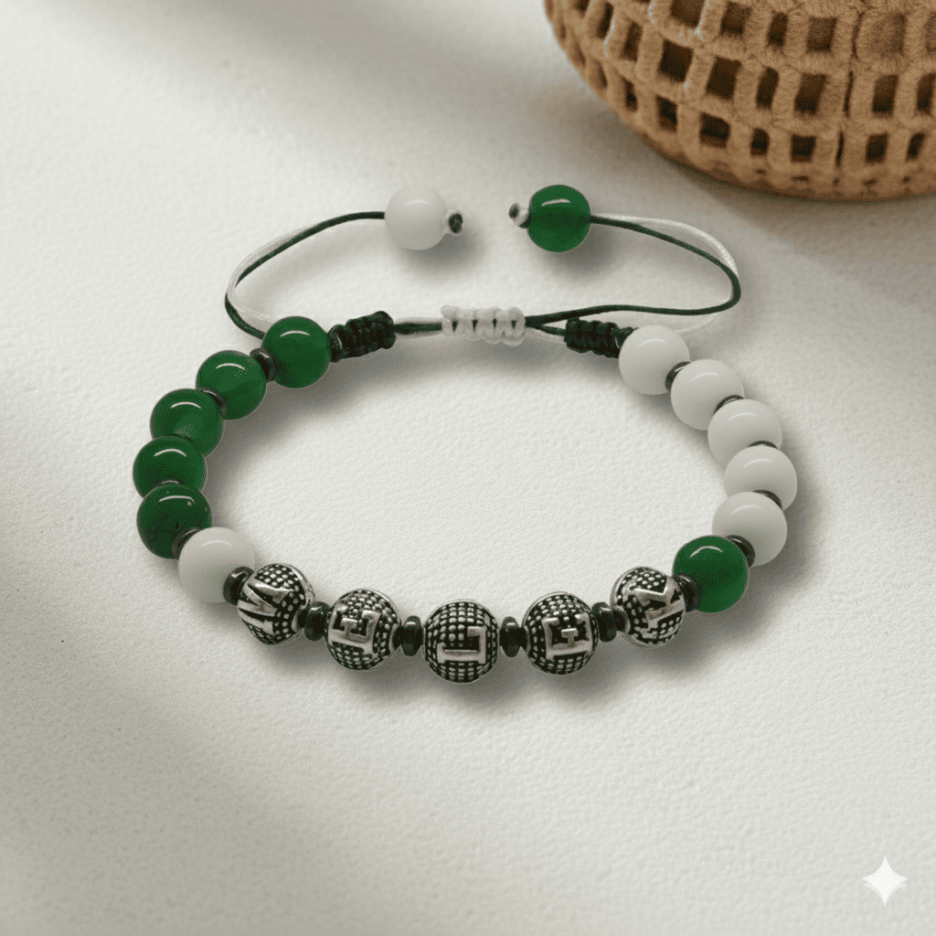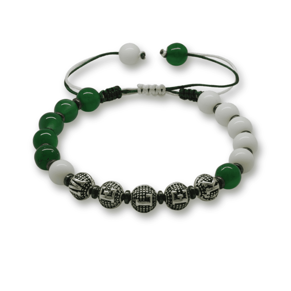 İsme Özel Yazılı Makrome Örgülü Küre Kesim Yeşil Beyaz Jade Hematit Doğaltaş Kadın Taraftar Bileklik