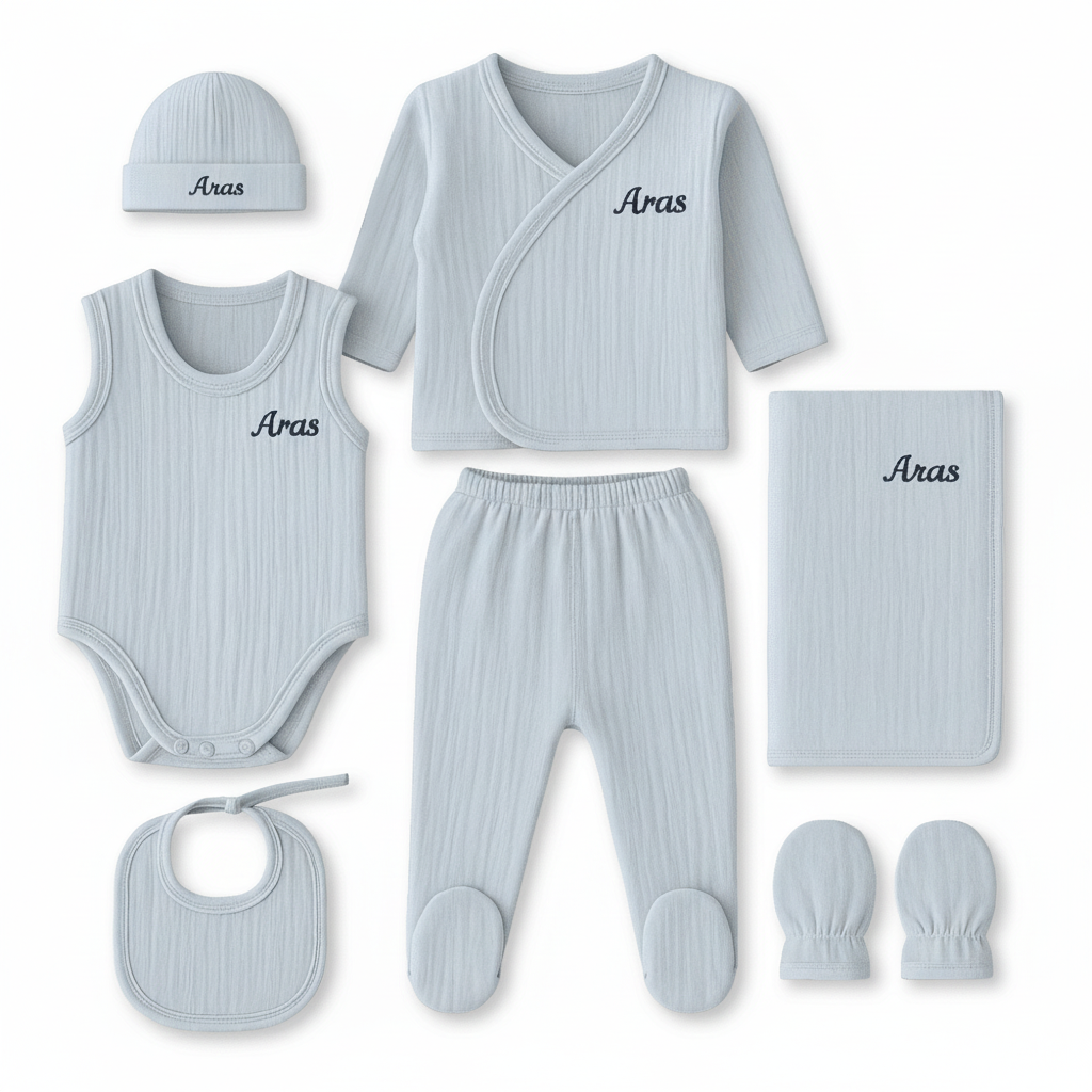 İsme Özel Nakışlı Mavi Müslin Kumaştan 7 li Yenidoğan Hastane Çıkış Bebek Takımı