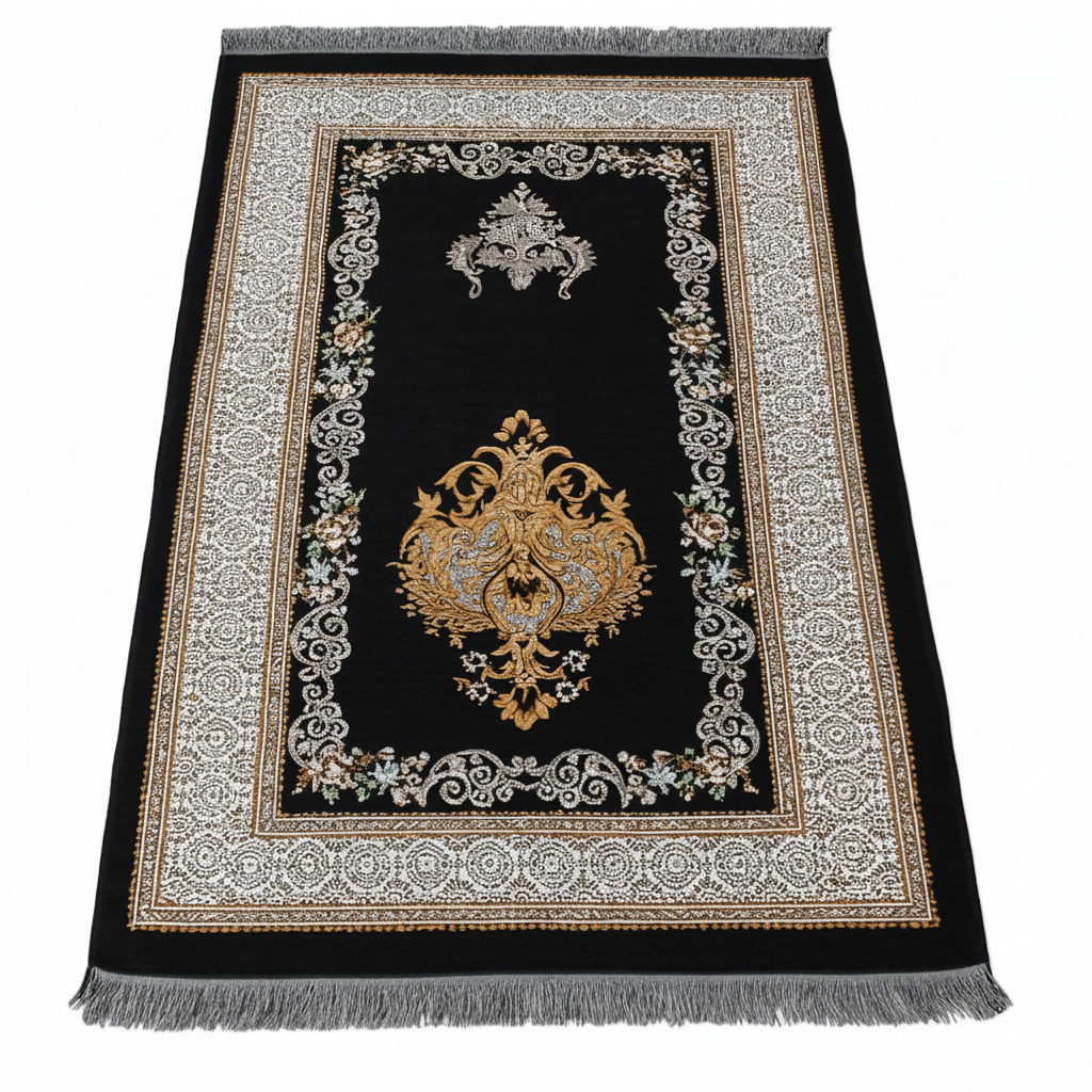 Kişiye Özel Nakış İşlemeli Çiçek Desenli Kendinden Saçaklı Siyah Renk Hediyelik Seccade