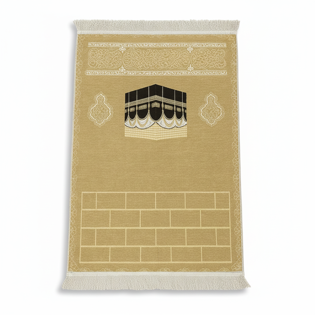 Kişiye Özel Nakış İşlemeli Kabe Motifli Saçaklı Krem Rengi Hediyelik Seccade