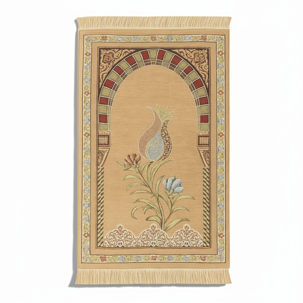 Kişiye Özel Nakış İşlemeli Lale Motifli Astarlı Saçaklı Krem Rengi Hediyelik Seccade