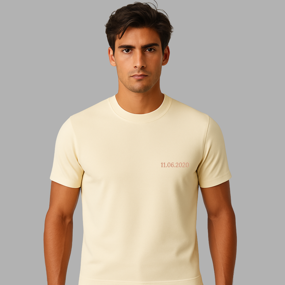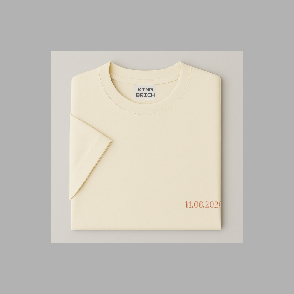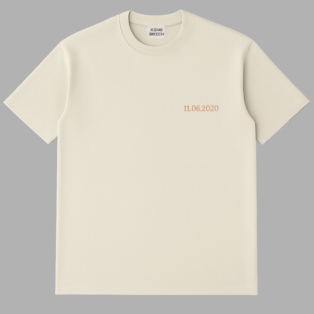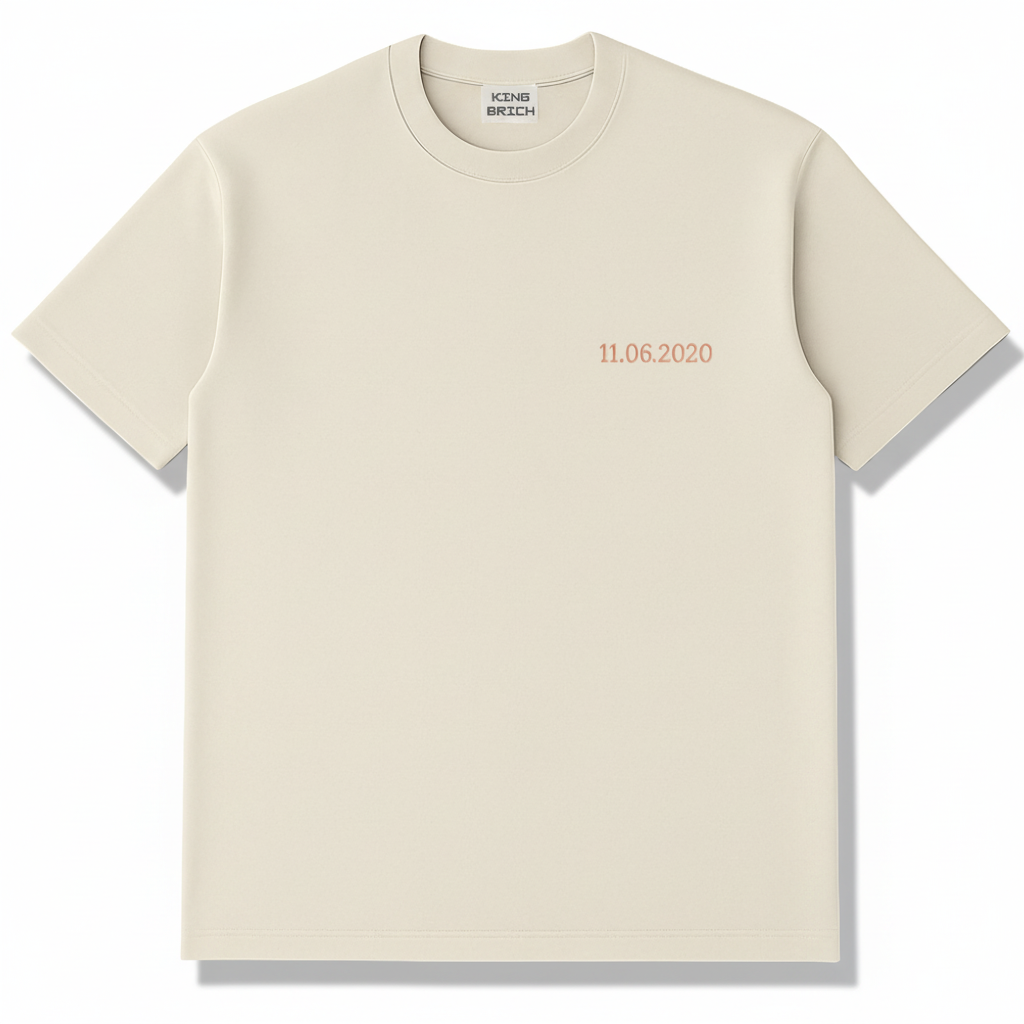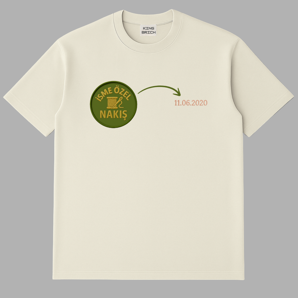 Kişiye Özel Nakışlı Yakası Biyeli Kısa Kollu Bisiklet Yaka Premium Krem Rengi Oversize Tişört L