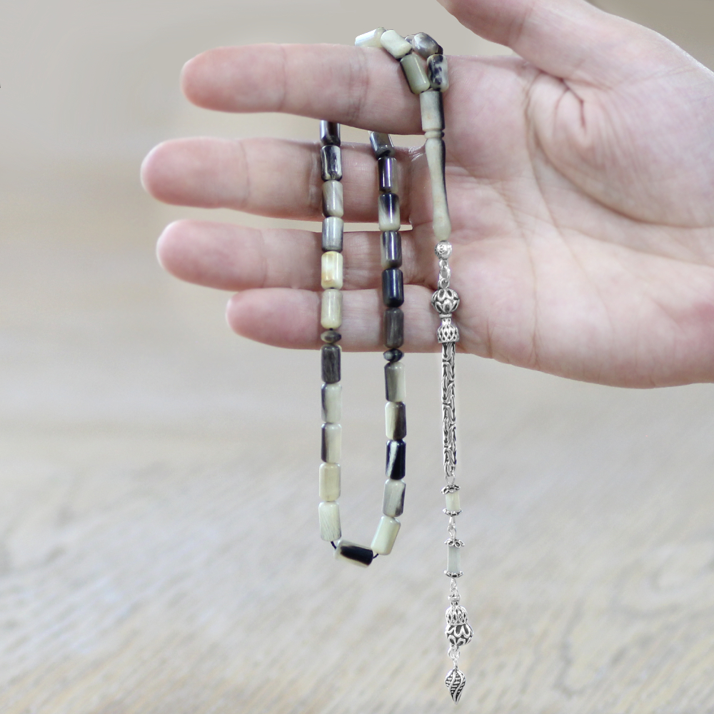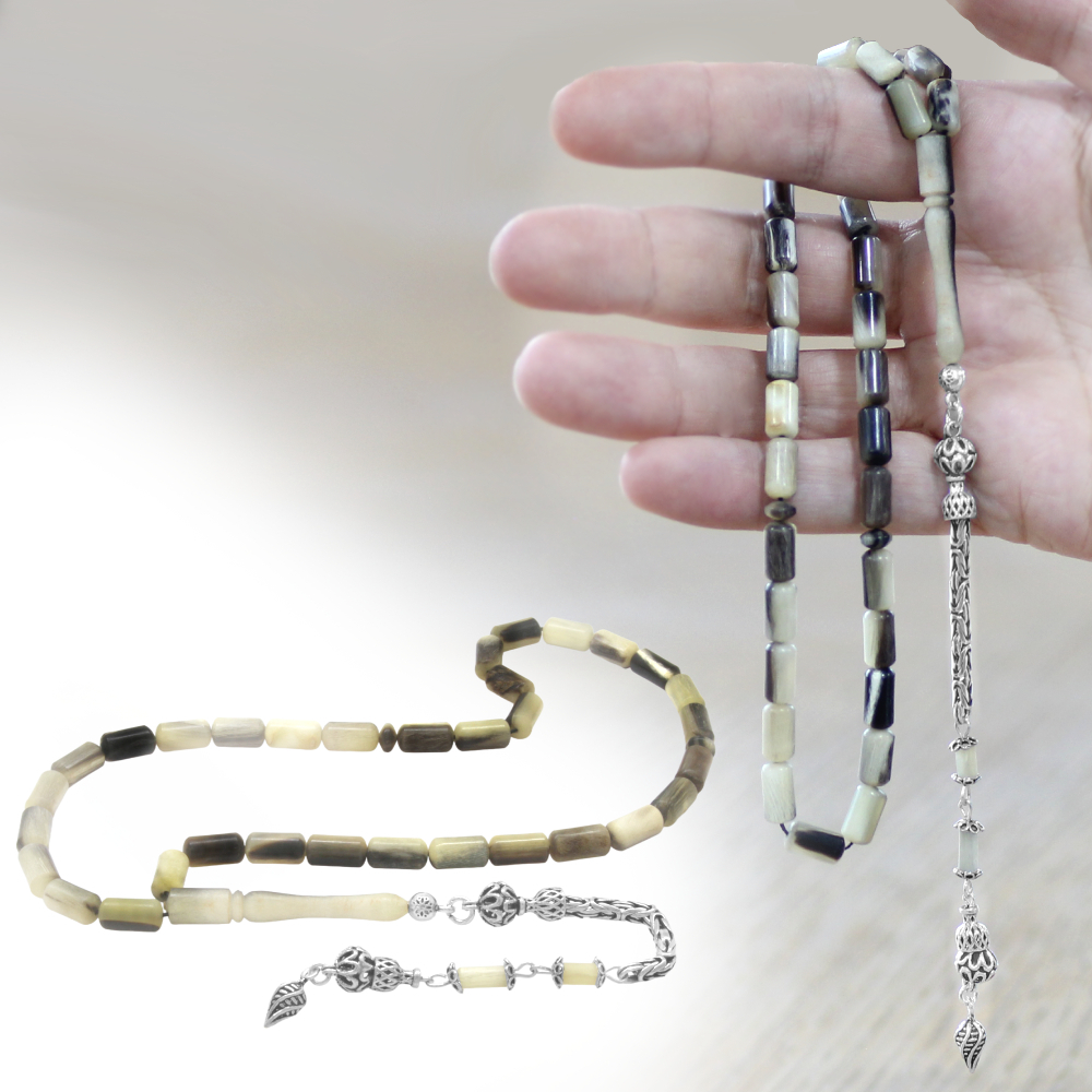 Koç Boynuzu Tesbih - Krem Rengi Siyah - 925 Ayar Gümüş Kral Zincir Püsküllü - Kapsül Kesim