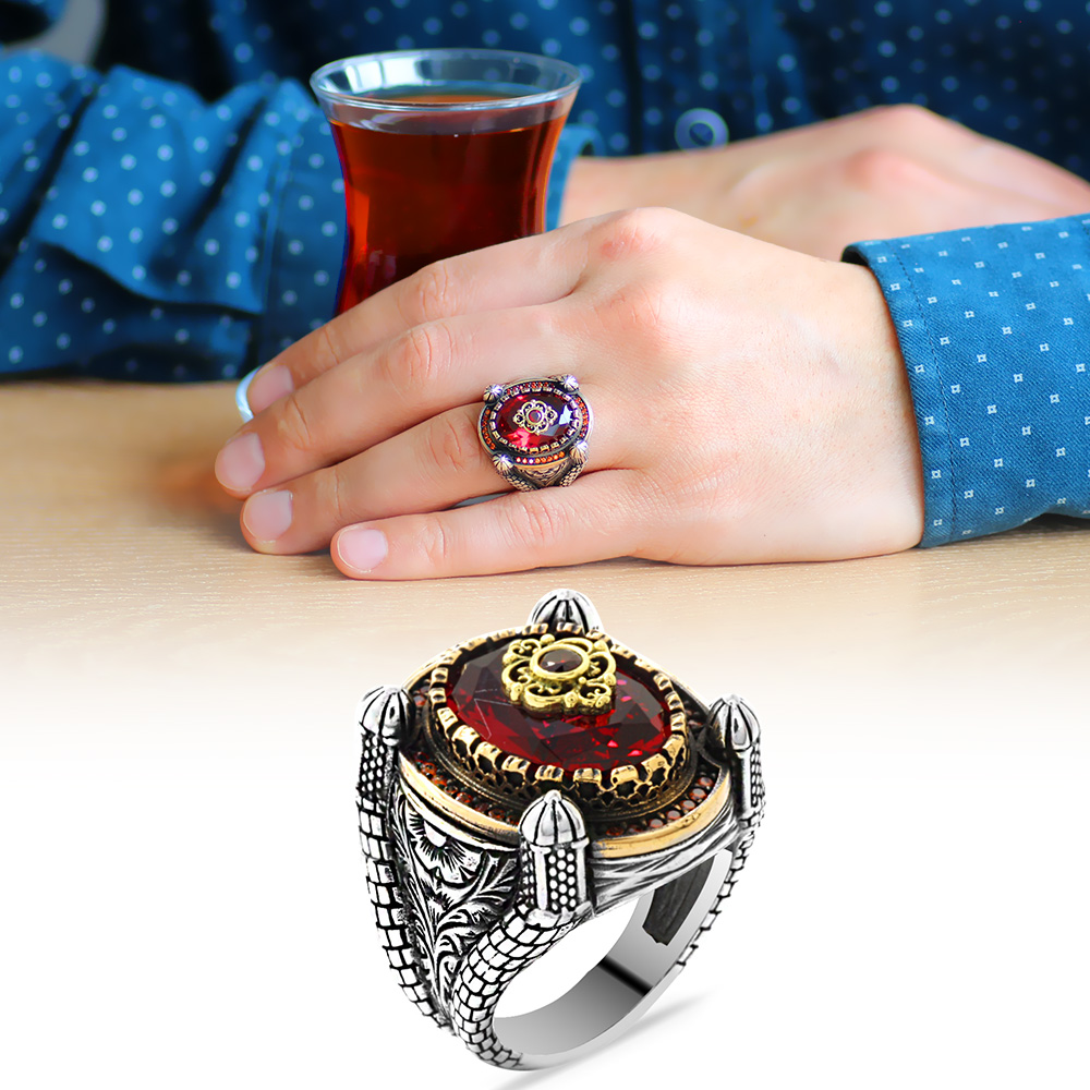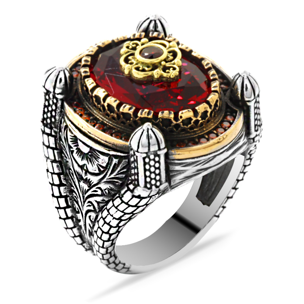 Kubbe Tasarım Faset Kesim Kırmızı Zirkon Taşlı 925 Ayar Gümüş Erkek Yüzük - 1
