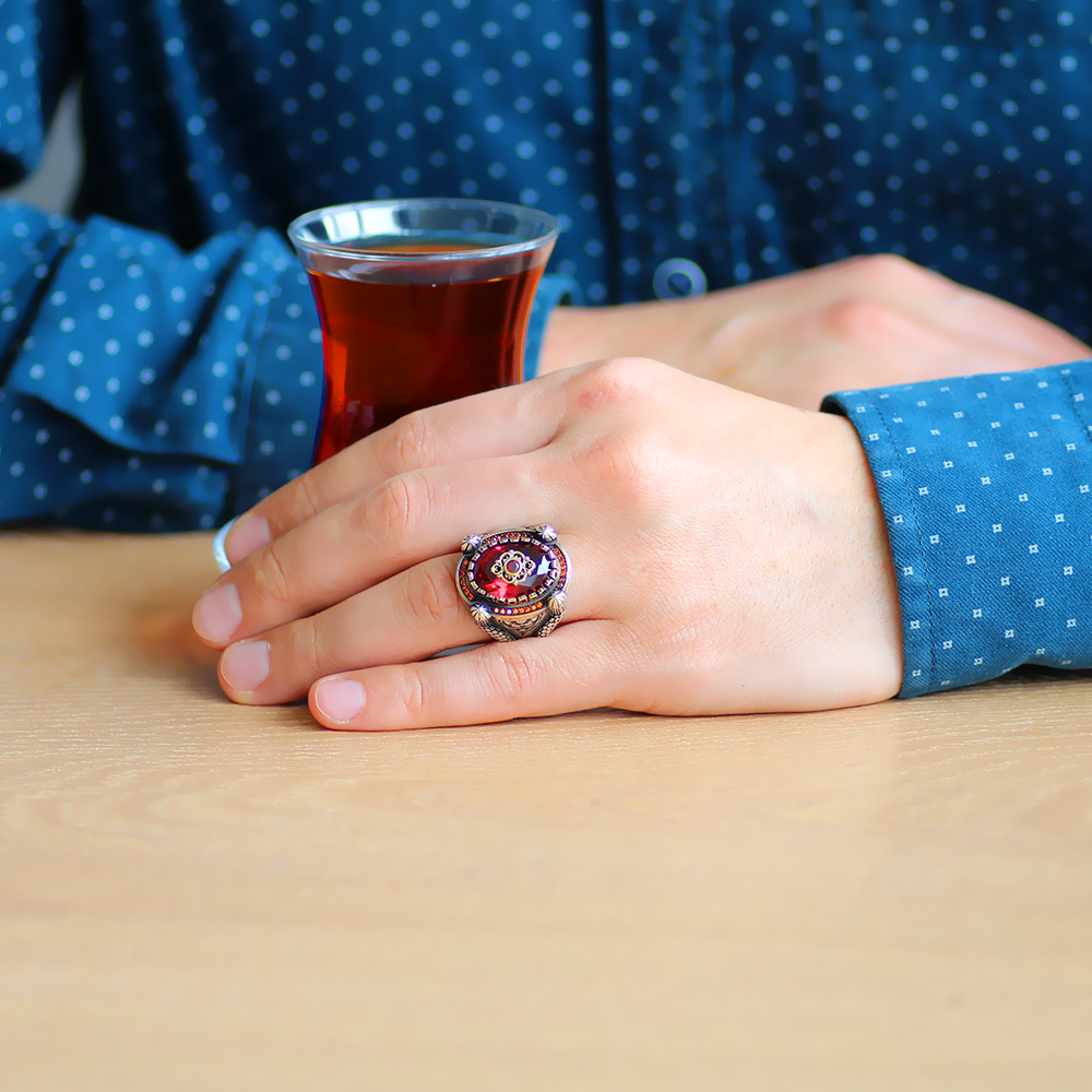 Kubbe Tasarım Faset Kesim Kırmızı Zirkon Taşlı 925 Ayar Gümüş Erkek Yüzük - 4