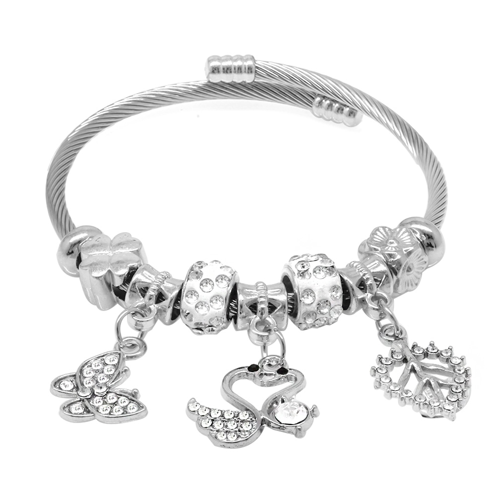 Kuğu ve Kelebek Detaylı Pandora Tasarım Gümüş Renk Çelik Kadın Sallantılı Bileklik