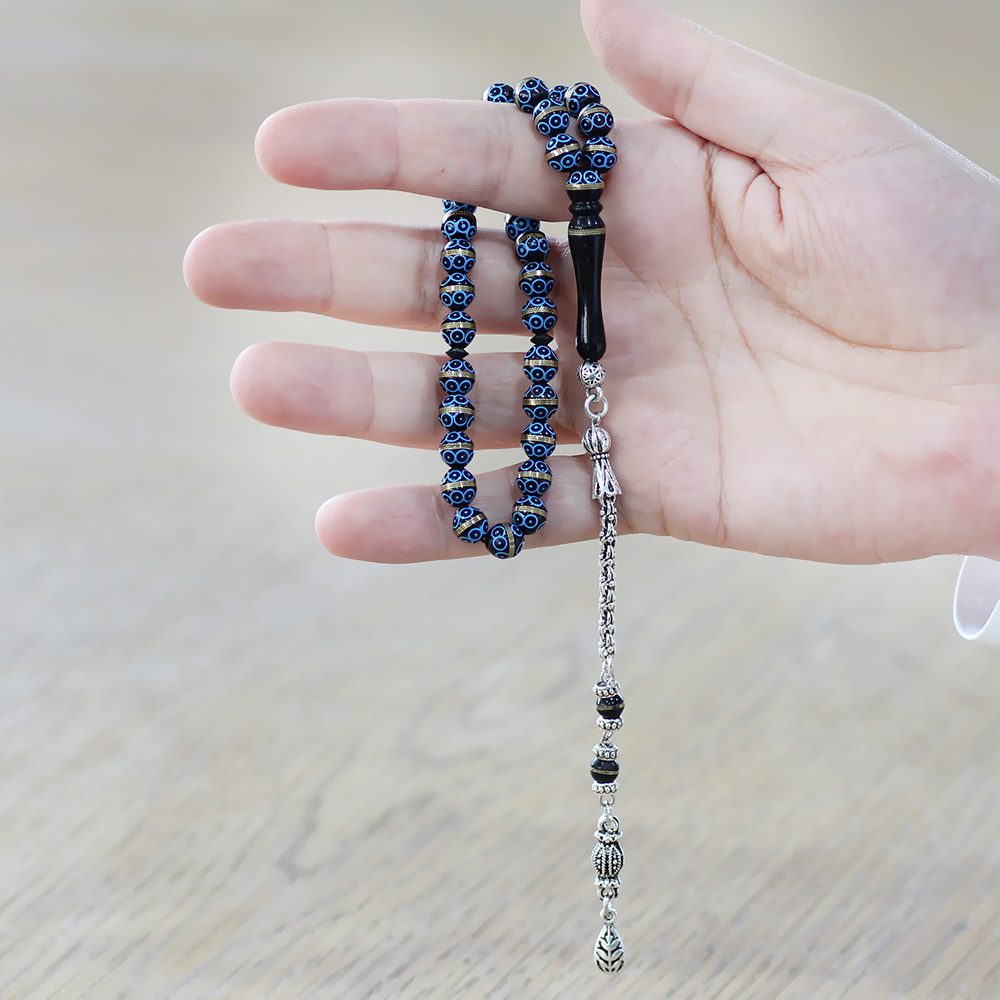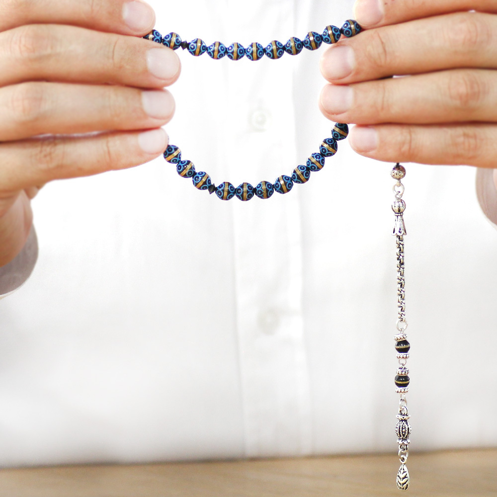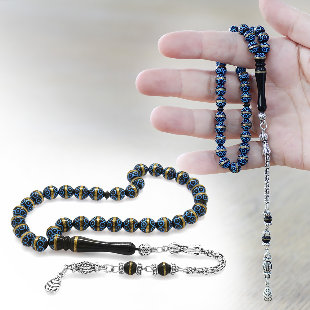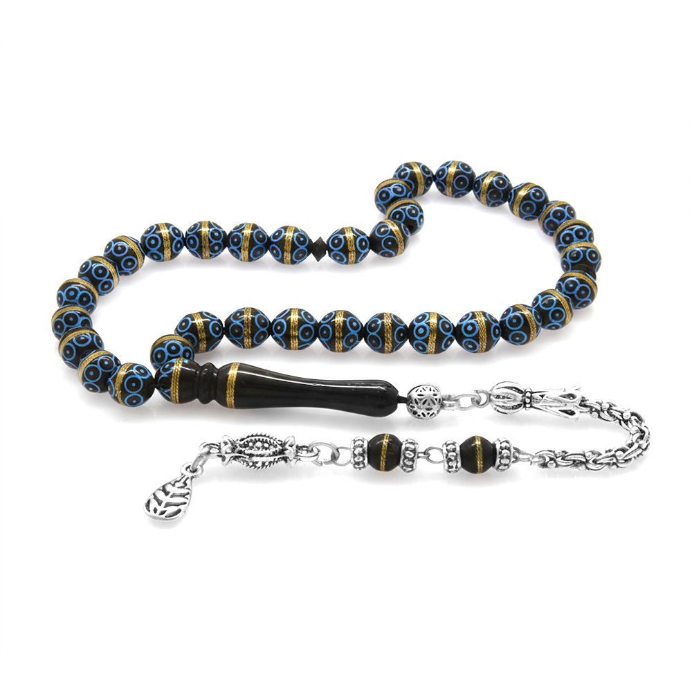 Kuka Tesbih - Kararmaz Metal Arnavut Püsküllü - Siyah Renk - Pirinç Sarma - Mavi Mineli - Küre Kesim