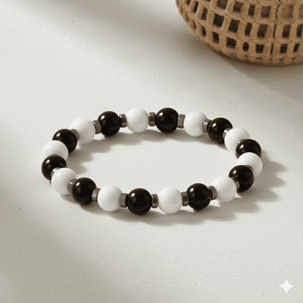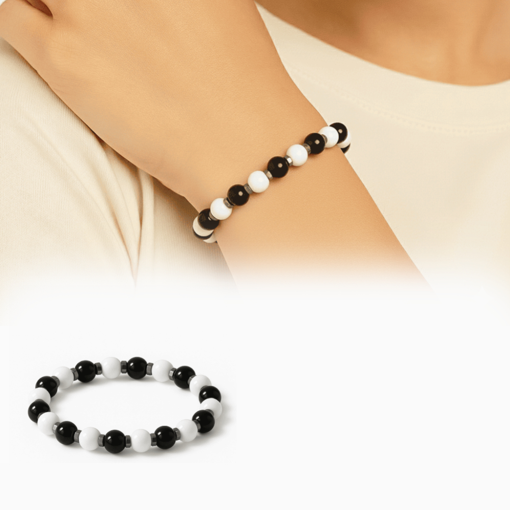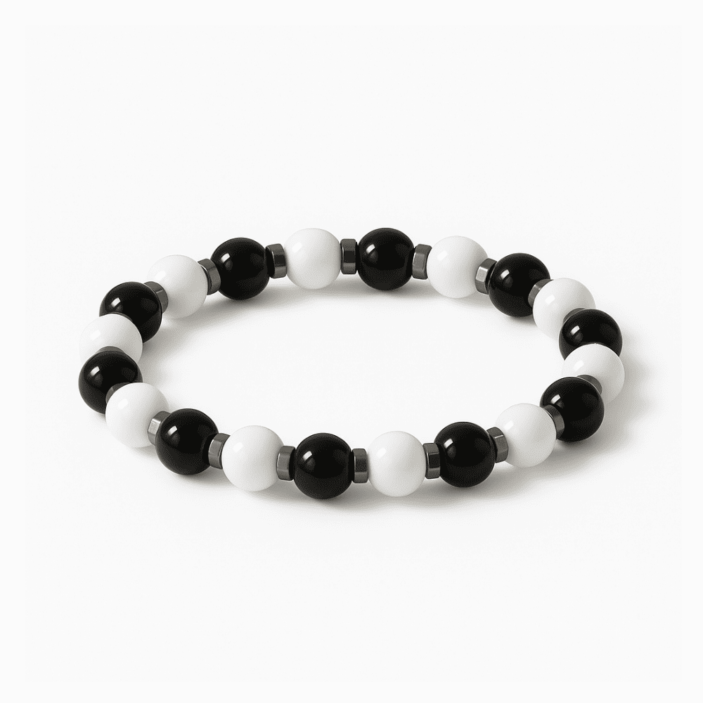 Küre Kesim Siyah Beyaz Jade Oniks Hematit Doğaltaş Kadın Taraftar Bileklik M2