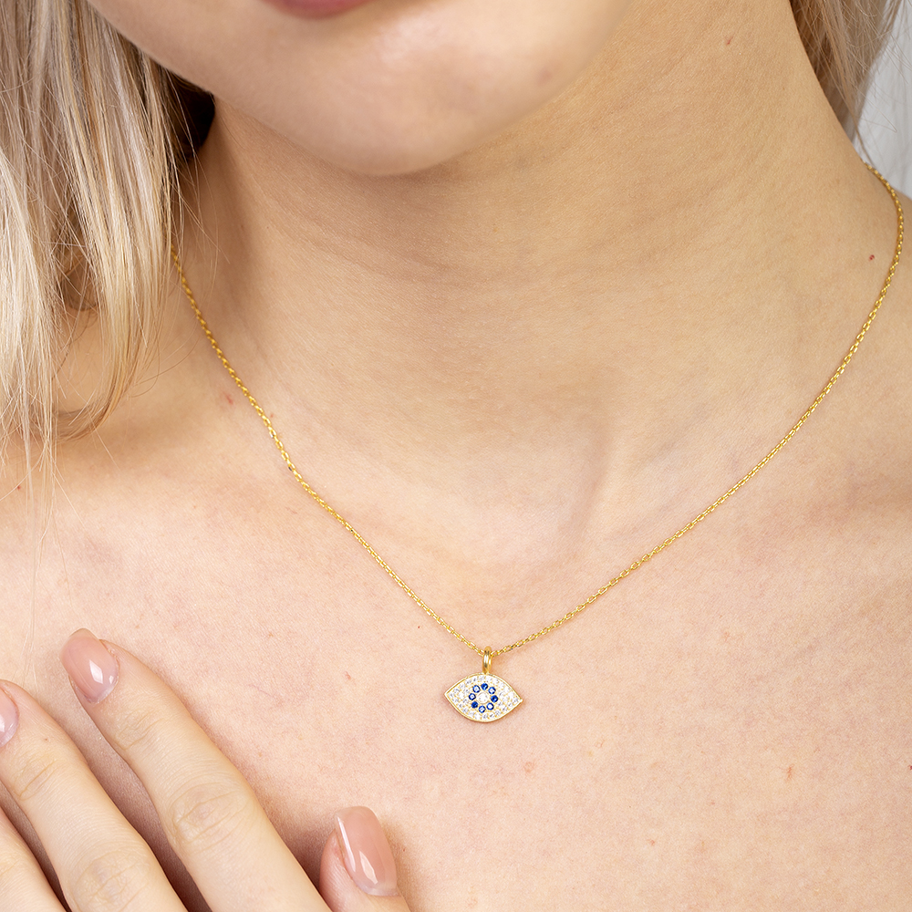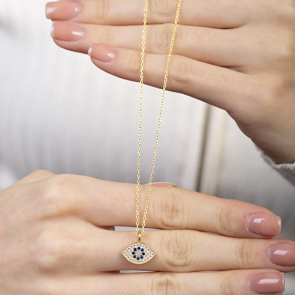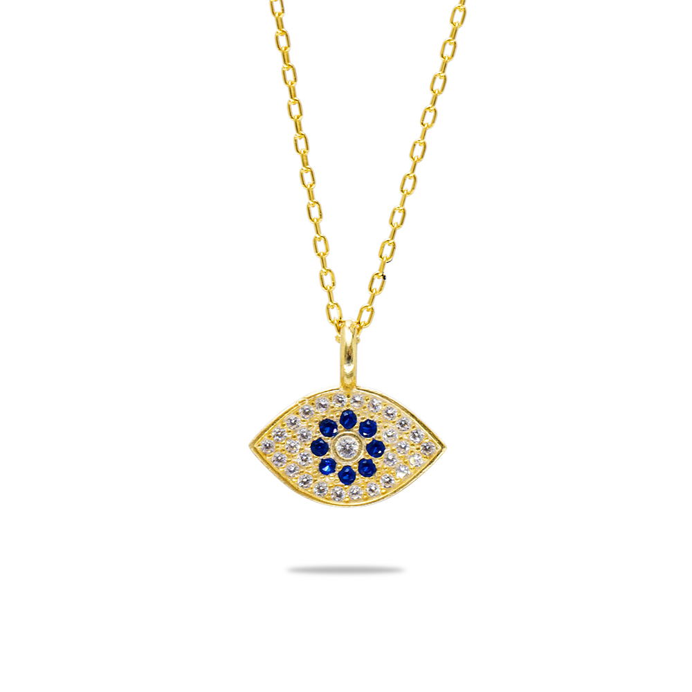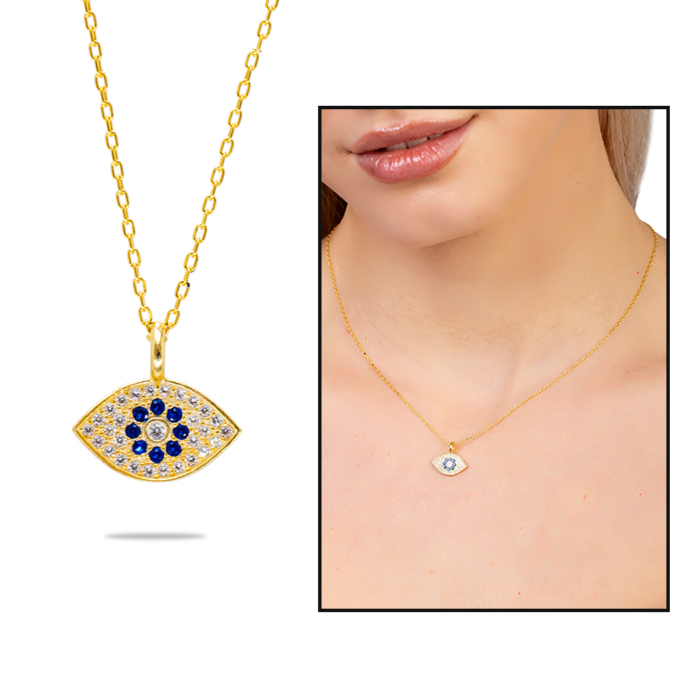 Lacivert Beyaz Zirkon Taşlı Göz Tasarım Altın Renk 925 Ayar Gümüş Kadın Kolye