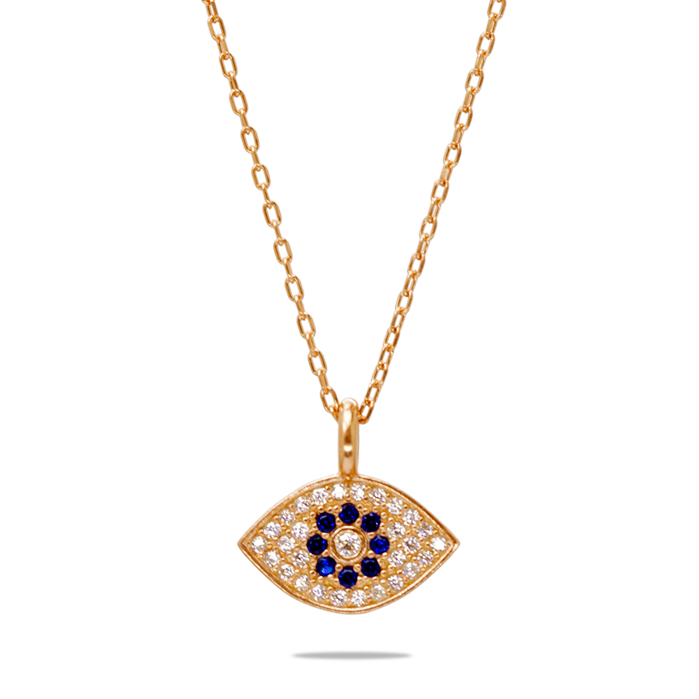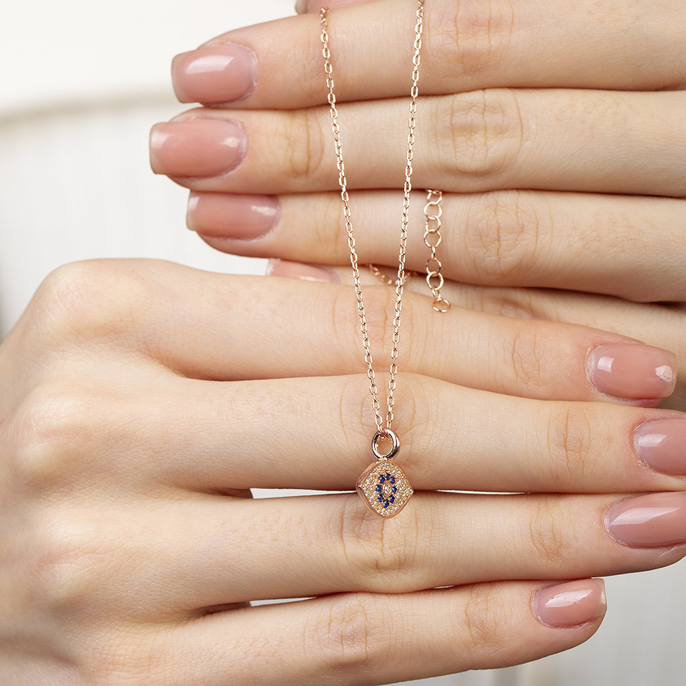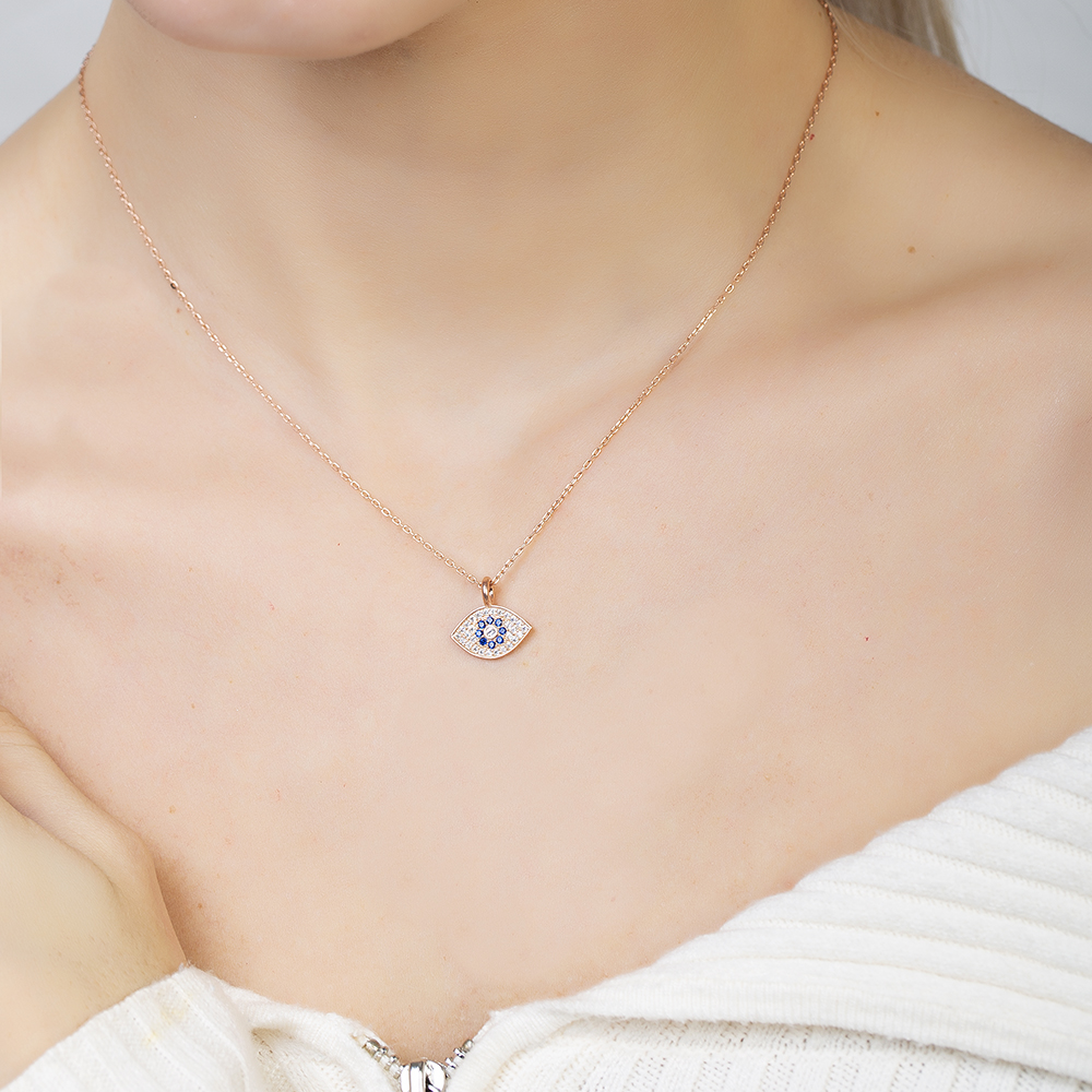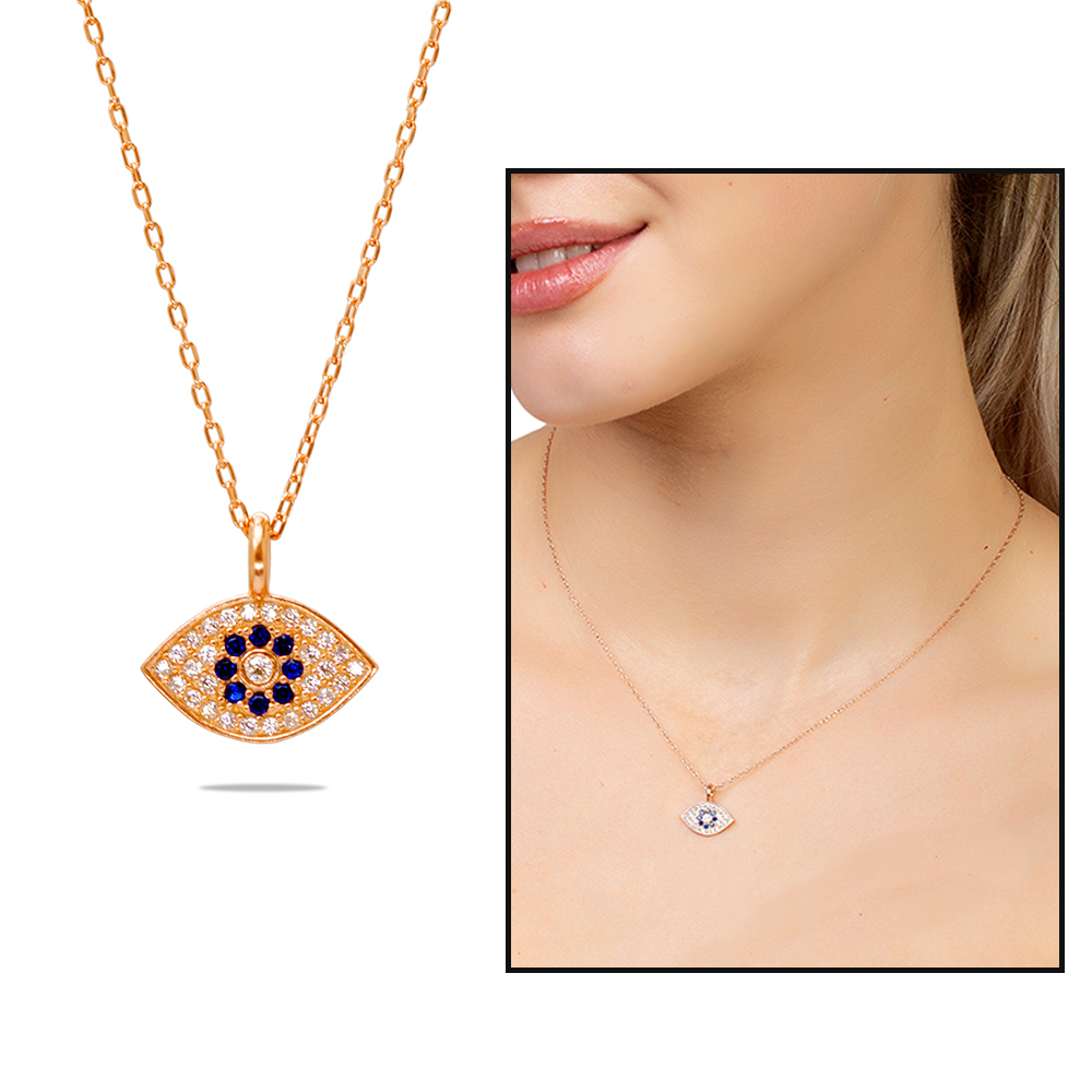 Lacivert Beyaz Zirkon Taşlı Göz Tasarım Rose Renk 925 Ayar Gümüş Kadın Kolye
