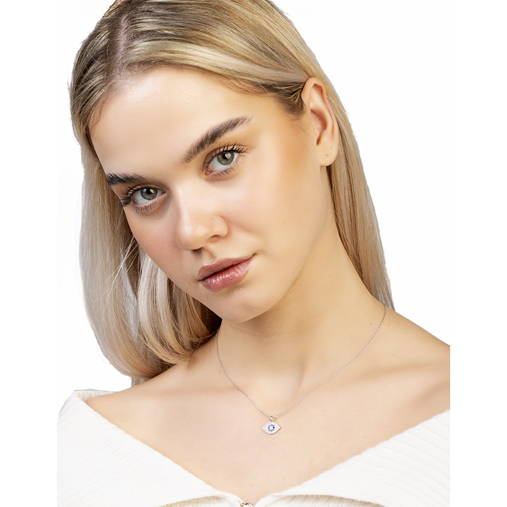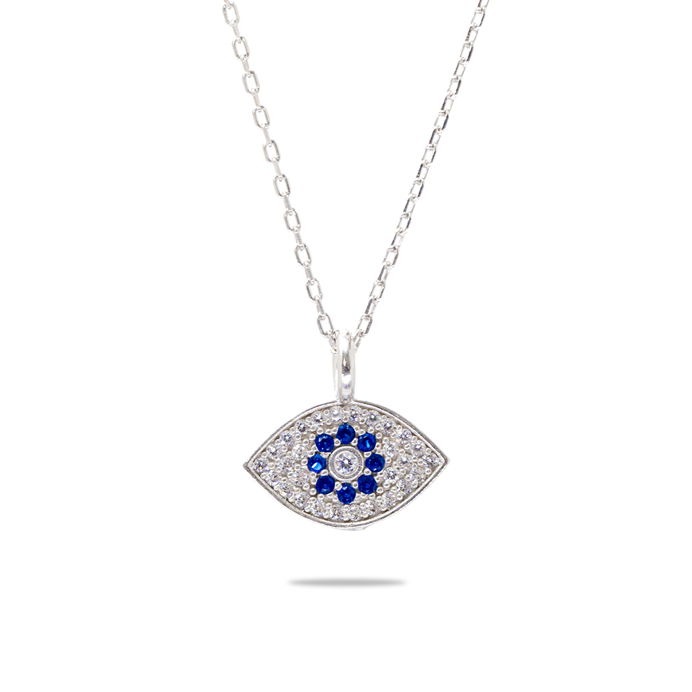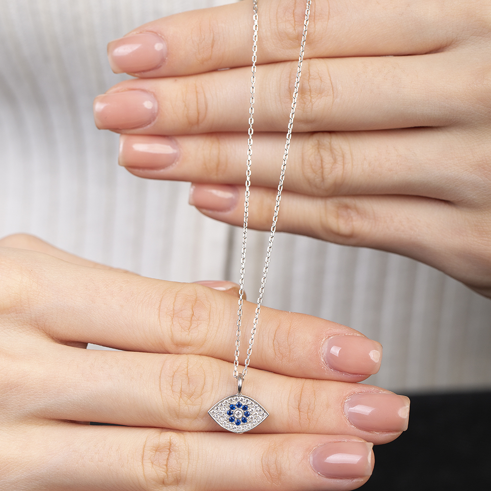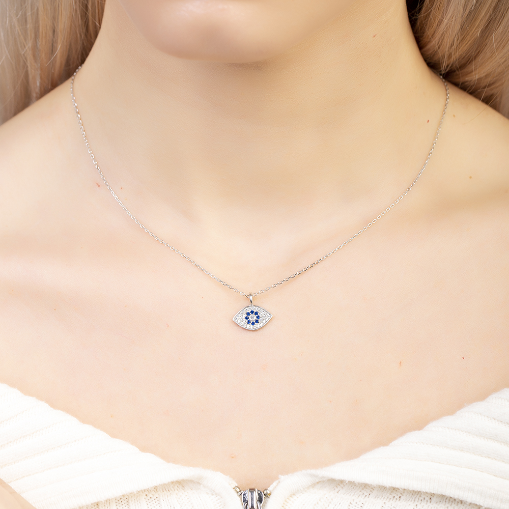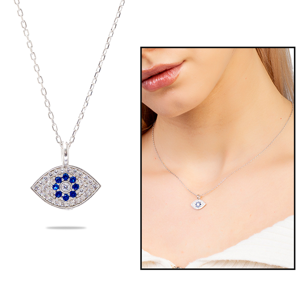 Lacivert Beyaz Zirkon Taşlı Göz Tasarım Gümüş Renk 925 Ayar Gümüş Kadın Kolye