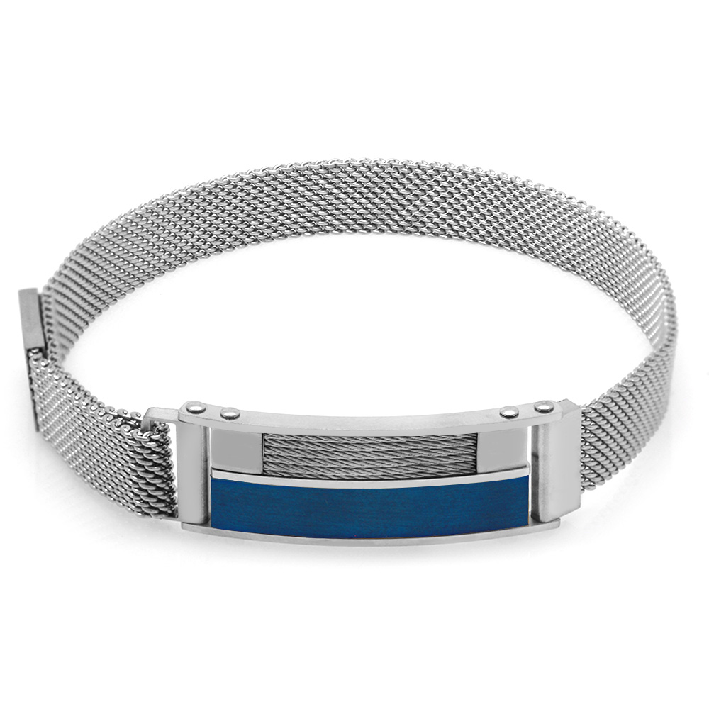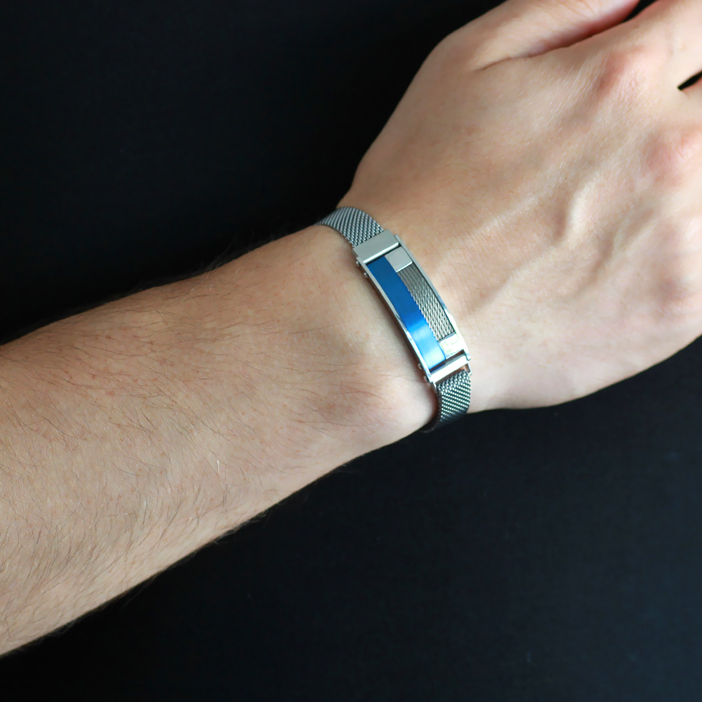 Lacivert Detaylı Kişiye Özel İsim Yazılı Magnet Kapamalı Gümüş Renk Çelik Erkek Hasır Bileklik - 1