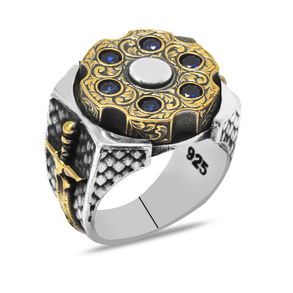 Lacivert Zirkon Taşlı Kılıç Detaylı Dönen Çark Tasarım 925 Ayar Gümüş Erkek Yüzük