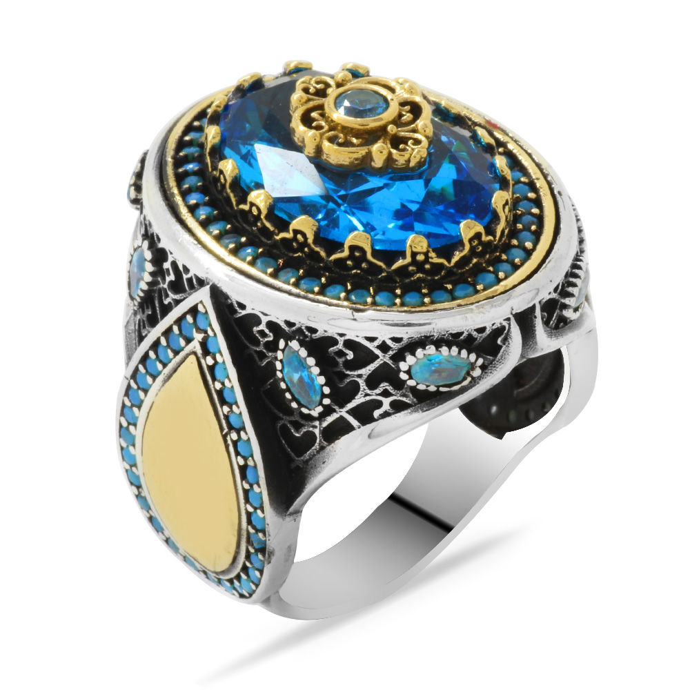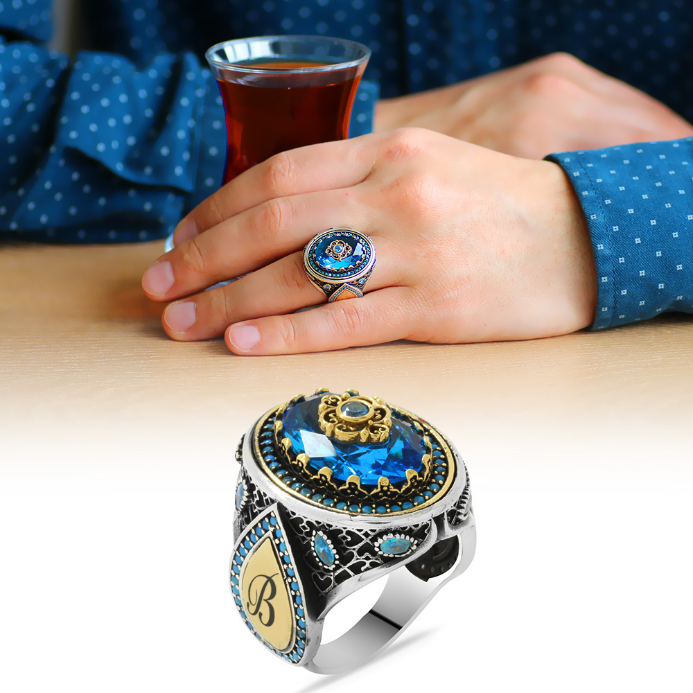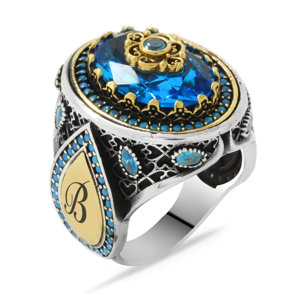 Lale Temalı Aqua Mavi Zirkon Taşlı İsme Özel Yazılı 925 Ayar Gümüş Erkek Yüzük