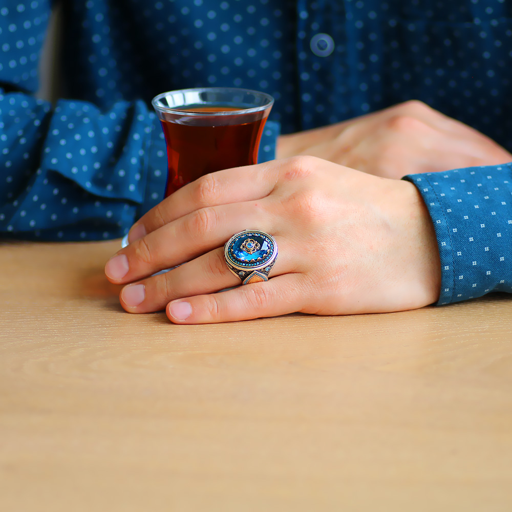 Lale Temalı Aqua Mavi Zirkon Taşlı İsme Özel Yazılı 925 Ayar Gümüş Erkek Yüzük - 1