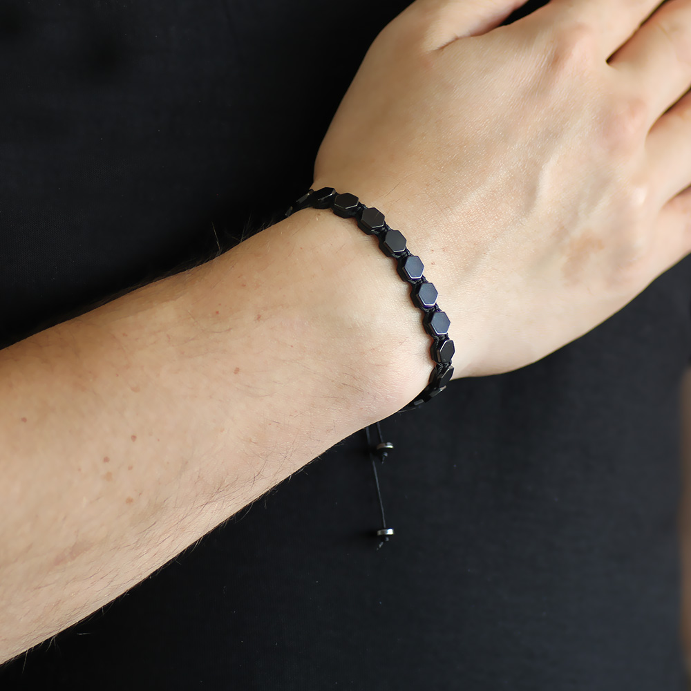 Makrome Örgülü Altıgen Tasarım Siyah Hematit Doğaltaş Bileklik - 1