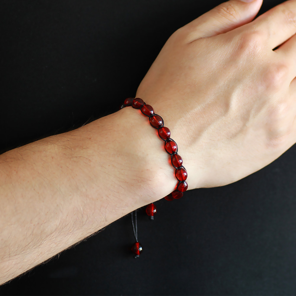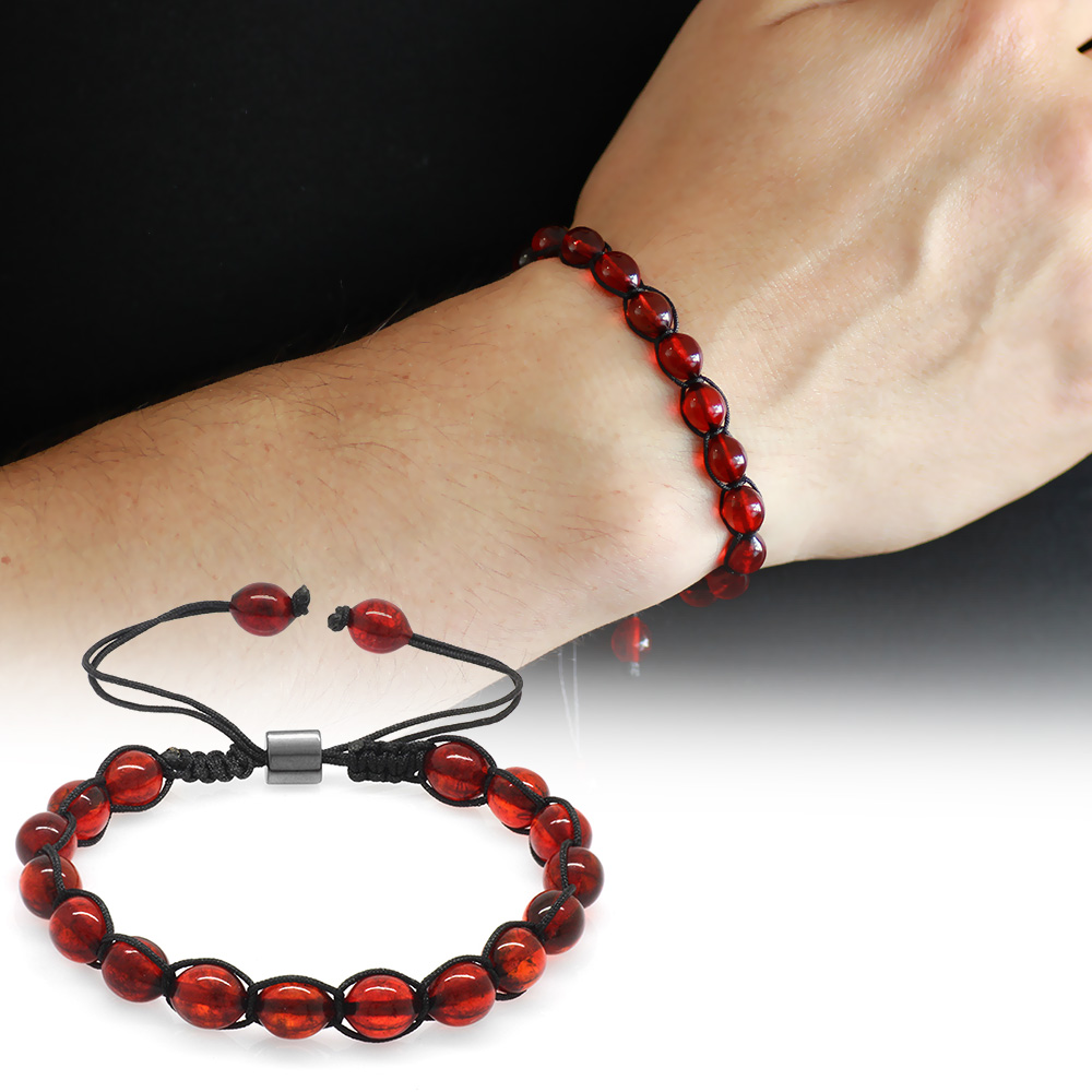 Makrome Örgülü Arpa Kesim Kırmızı Doğal Damla Kehribar Erkek Bileklik - 1