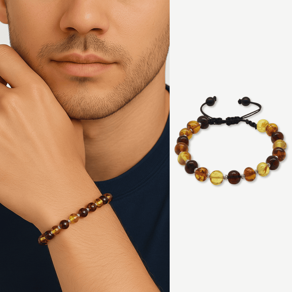 Makrome Örgülü Dorika Detaylı Multicolor Natural Form Doğal Damla Kehribar Erkek Bileklik