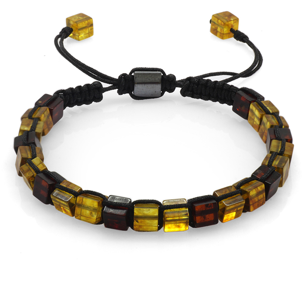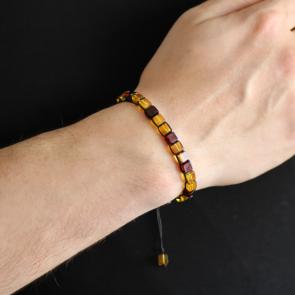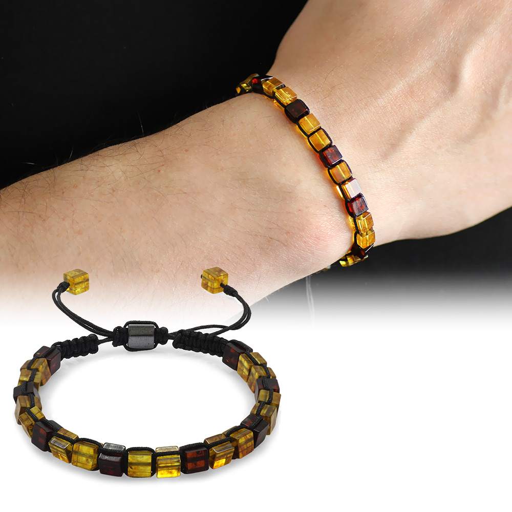 Makrome Örgülü Küp Kesim Sarı Koyu Kırmızı Doğal Damla Kehribar Erkek Bileklik - 1