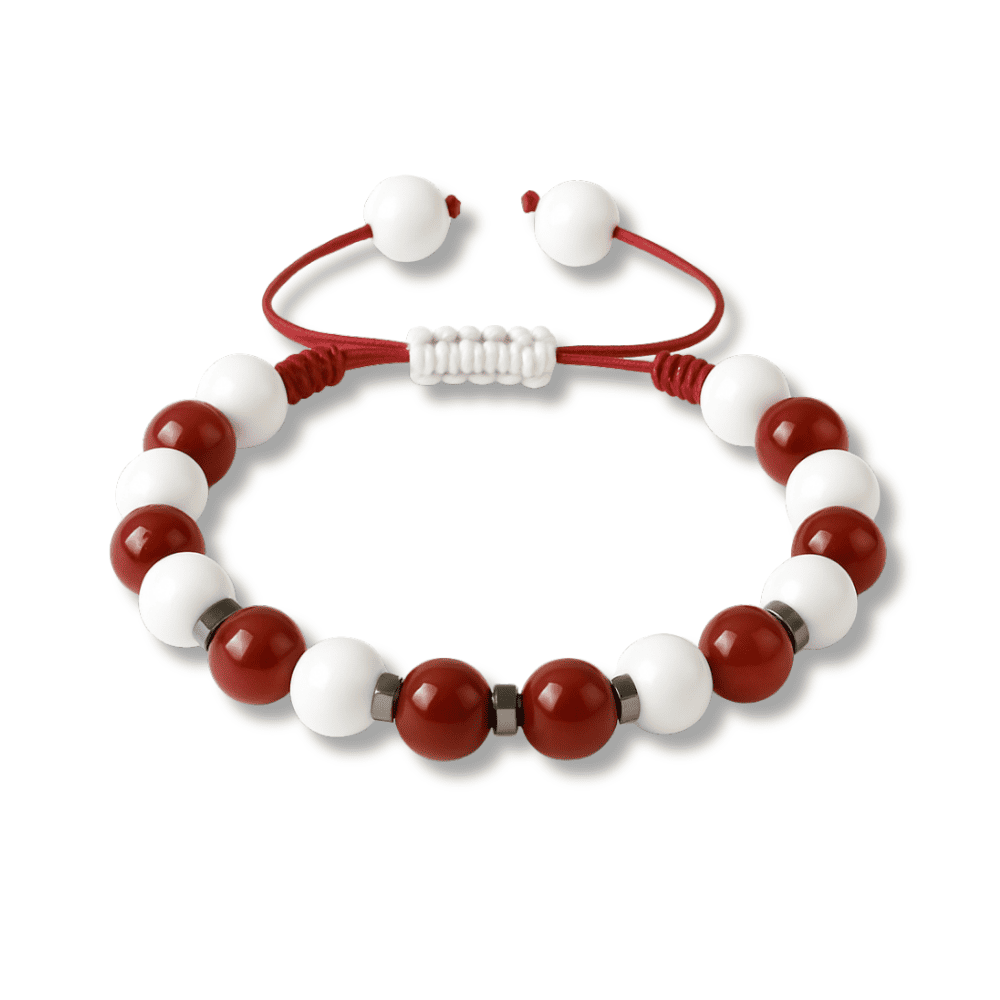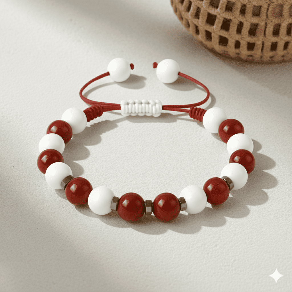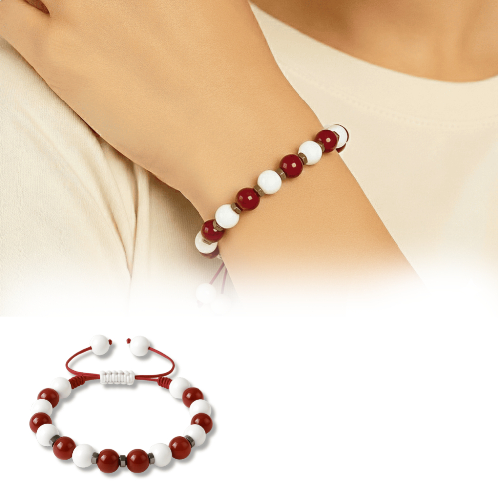 Makrome Örgülü Küre Kesim Kırmızı Beyaz Jade Akik Hematit Doğaltaş Kadın Taraftar Bileklik