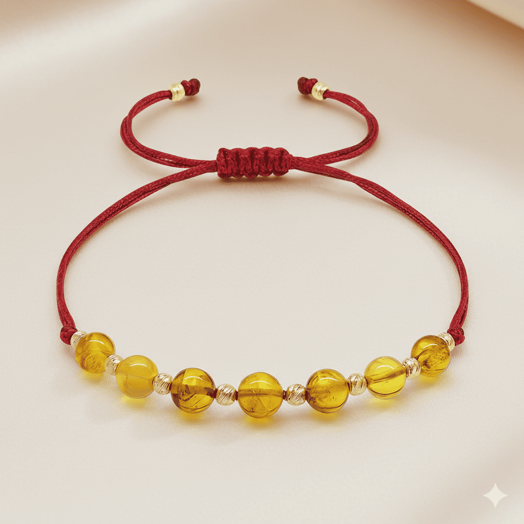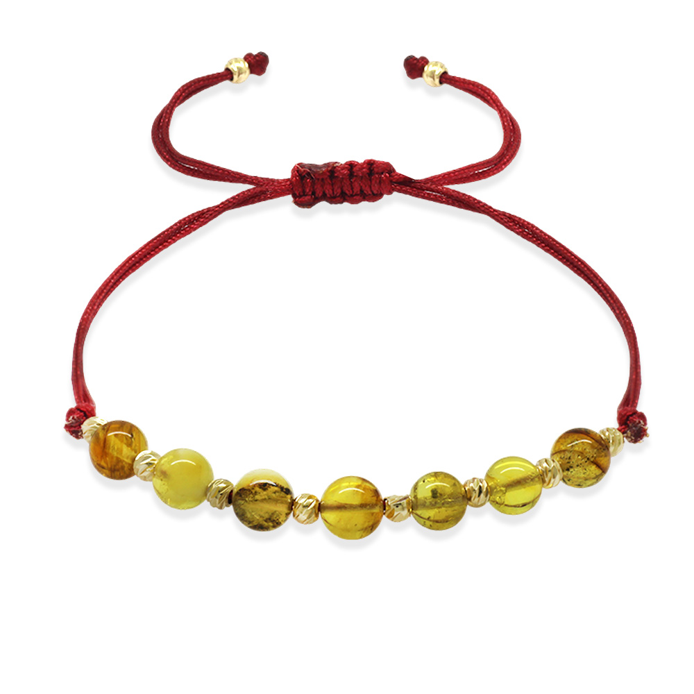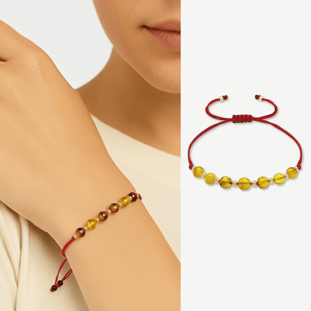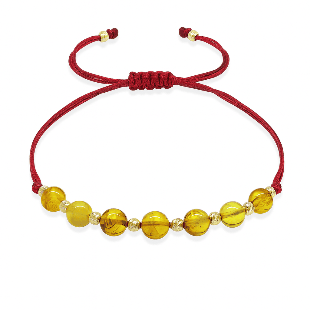 Makrome Örgülü Kırmızı İpli Dorika Top Süslemeli Sarı Renk Doğal Damla Kehribar Kadın Bileklik
