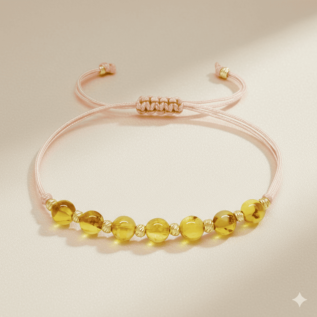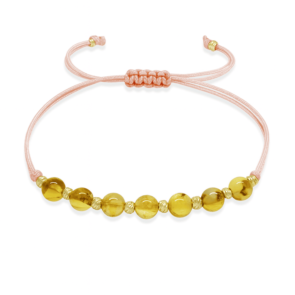 Makrome Örgülü Küre Kesim Pembe İp Dorika Top Sarı Renk Fosilli Doğal Damla Kehribar Kadın Bileklik