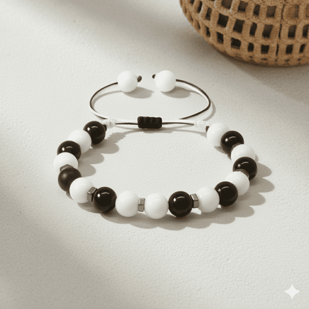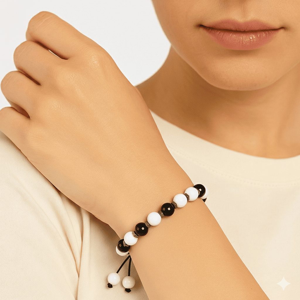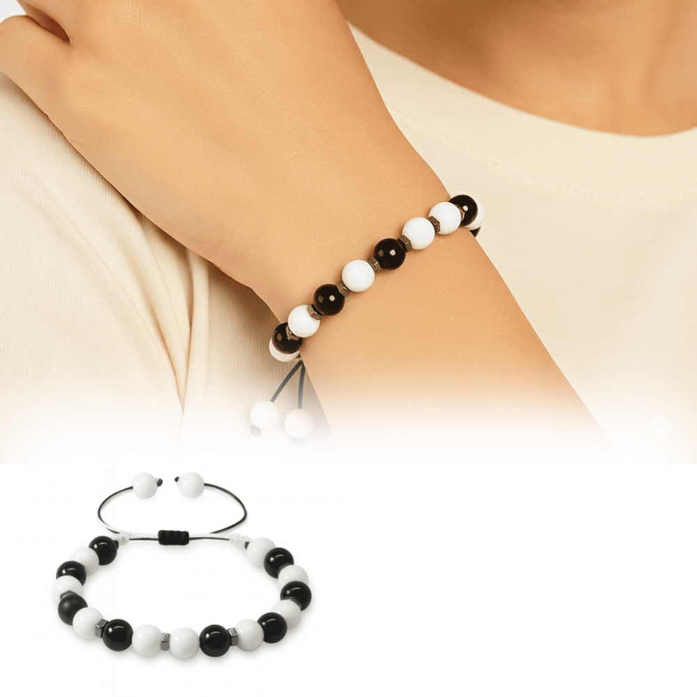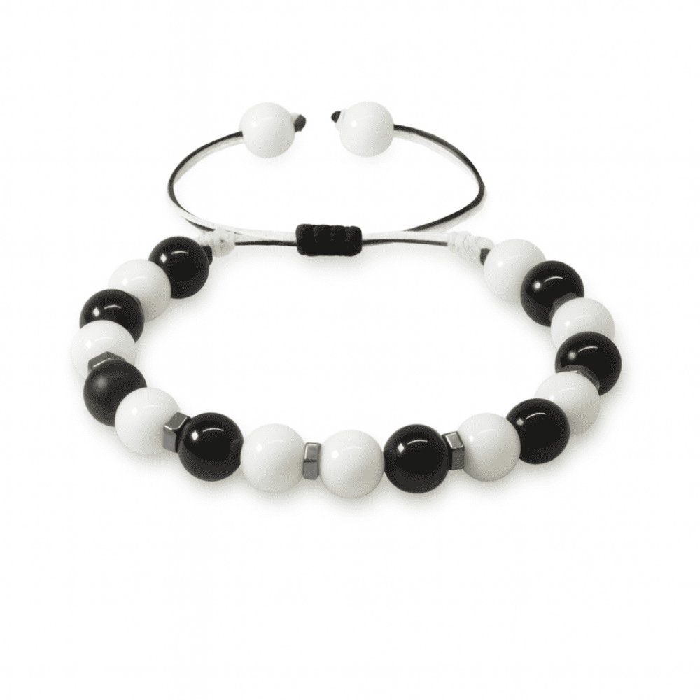 Makrome Örgülü Küre Kesim Siyah Beyaz Jade Oniks Hematit Doğaltaş Kadın Taraftar Bileklik