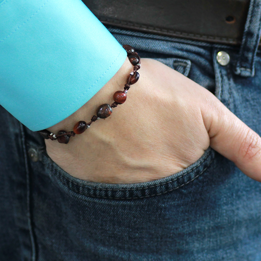 Makrome Örgülü Naturel Kesim Dorika Top Detaylı Koyu Renk Kaplan Gözü Doğaltaş Erkek Bileklik