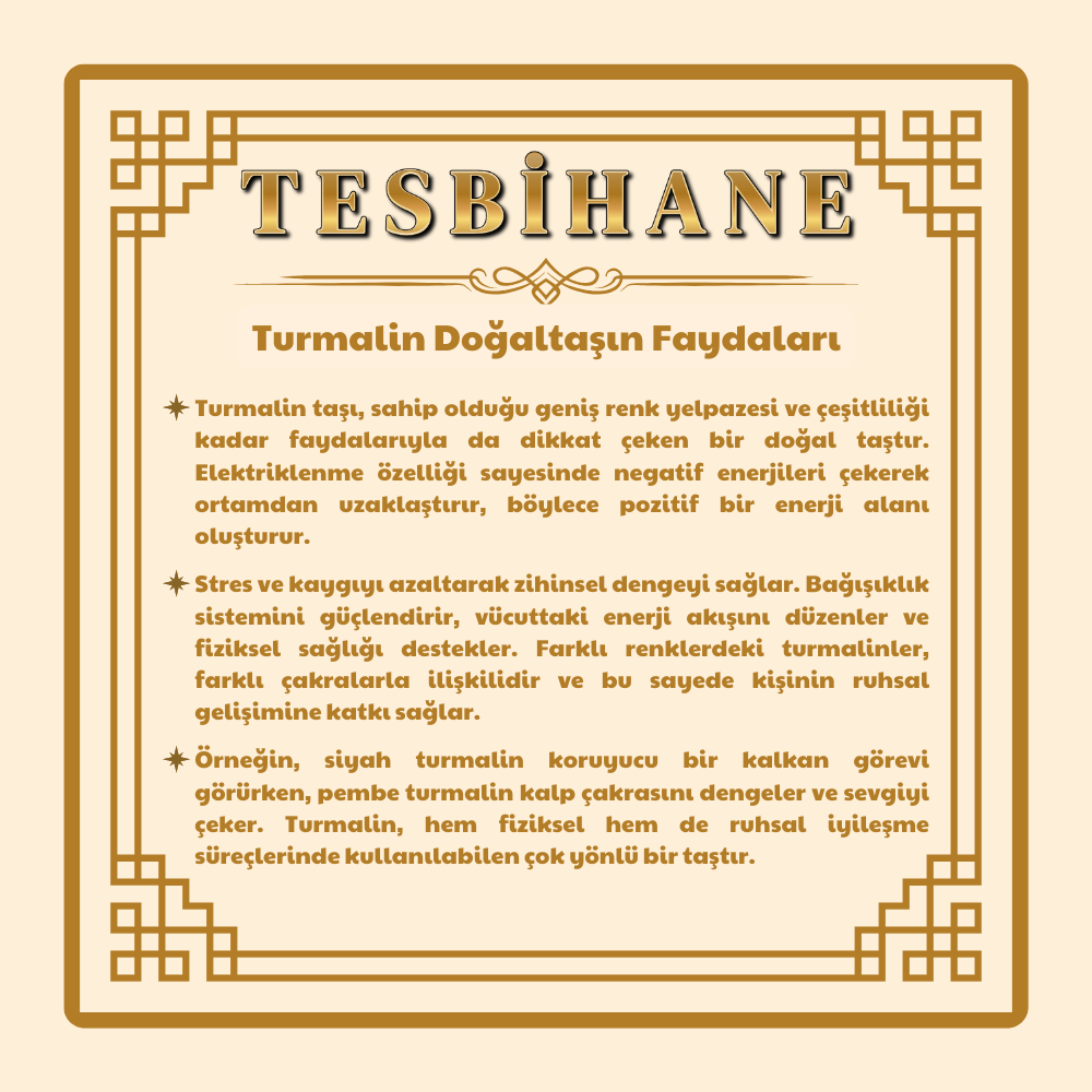 Turmalin taşı, geniş renk yelpazesi ve çeşitliliği ile bilinen değerli bir doğal taştır. Negatif enerjileri uzaklaştırdığı ve pozitif bir enerji alanı oluşturduğu düşünülür. Stres ve kaygıyı azaltarak zihinsel denge sağlamaya yardımcı olabileceği rivâyet edilir. Bağışıklık sistemini desteklediği ve vücuttaki enerji akışını düzenlediği söylenir. Farklı renkleri farklı çakralarla ilişkilendirildiği için ruhsal gelişime katkıda bulunabileceğine inanılır. Siyah turmalin koruyucu bir etki sağlarken, pembe turmalin kalp çakrasını dengeleyip sevgiyi desteklediği rivâyet edilmektedir. Hem fiziksel hem de ruhsal süreçlerde faydalı olduğu düşünülür.